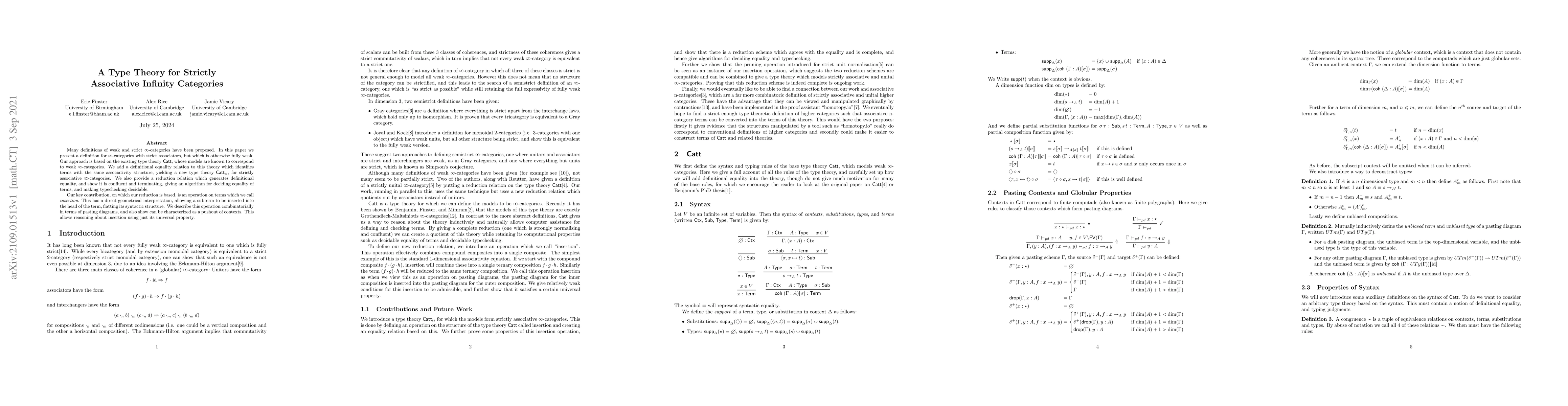 This paper introduces a novel type theory, Catt$_{sa}$, for strictly associative infinity categories, extending the existing type theory Catt with a definitional equality relation to identify terms based on their associativity structure. The authors provide a reduction relation that makes typechecking decidable and describe an insertion operation characterized combinatorially via pasting diagrams.