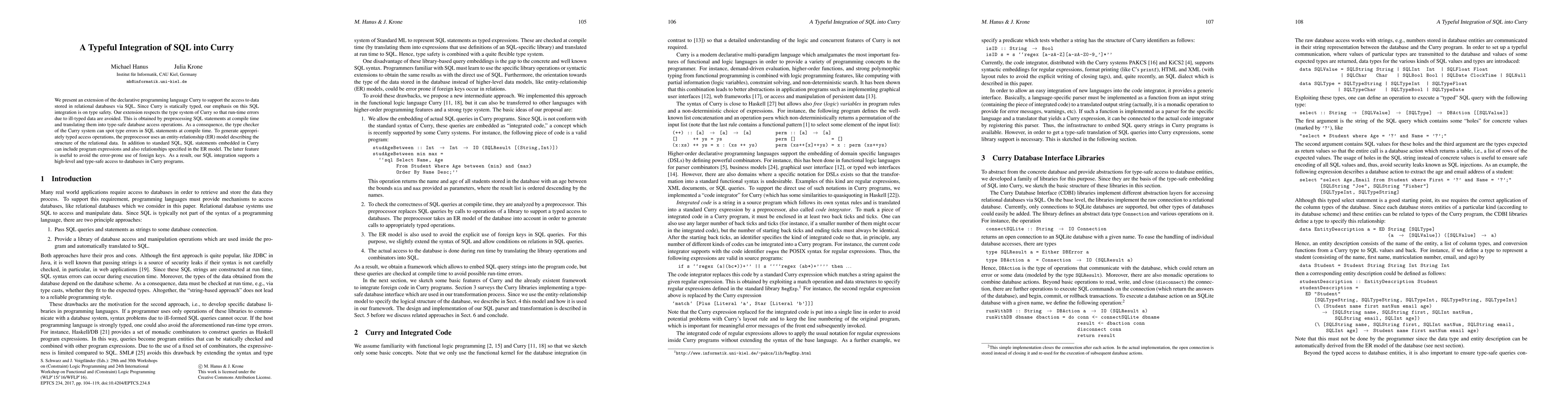 This paper extends the statically typed language Curry to safely integrate SQL for relational database access, ensuring type safety through compile-time preprocessing and translation of SQL into type-safe operations, leveraging an entity-relationship model to avoid errors.