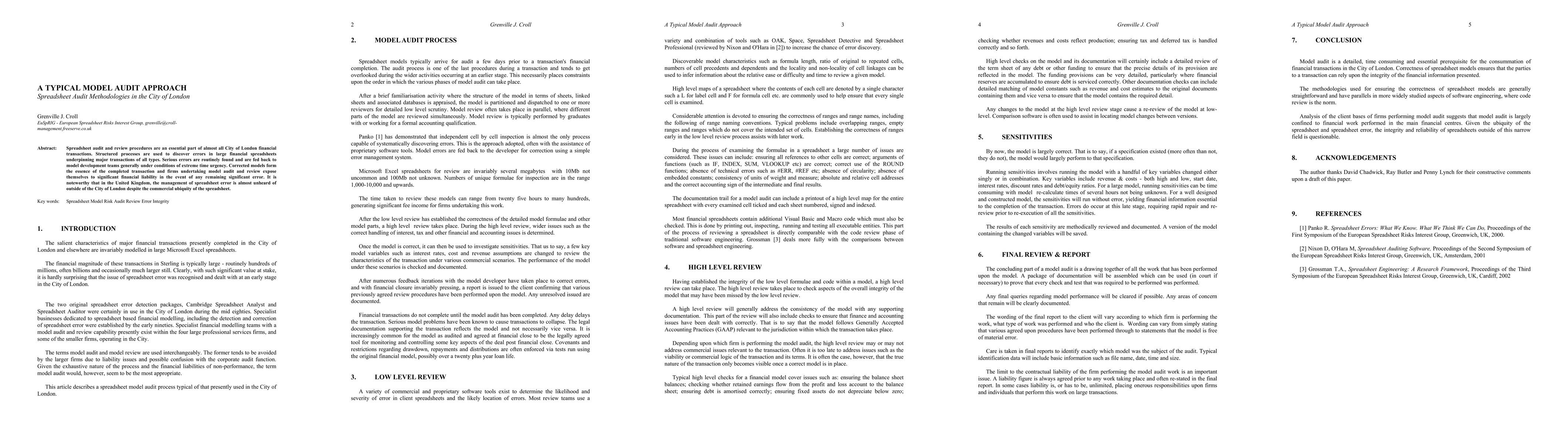 Spreadsheet audit and review procedures are an essential part of almost all City of London financial transactions. Structured processes are used to discover errors in large financial spreadsheets underpinning major transactions of all types. Serious errors are routinely found and are fed back to model development teams generally under conditions of extreme time urgency. Corrected models form the essence of the completed transaction and firms undertaking model audit and review expose themselves to significant financial liability in the event of any remaining significant error. It is noteworthy that in the United Kingdom, the management of spreadsheet error is almost unheard of outside of the City of London despite the commercial ubiquity of the spreadsheet.