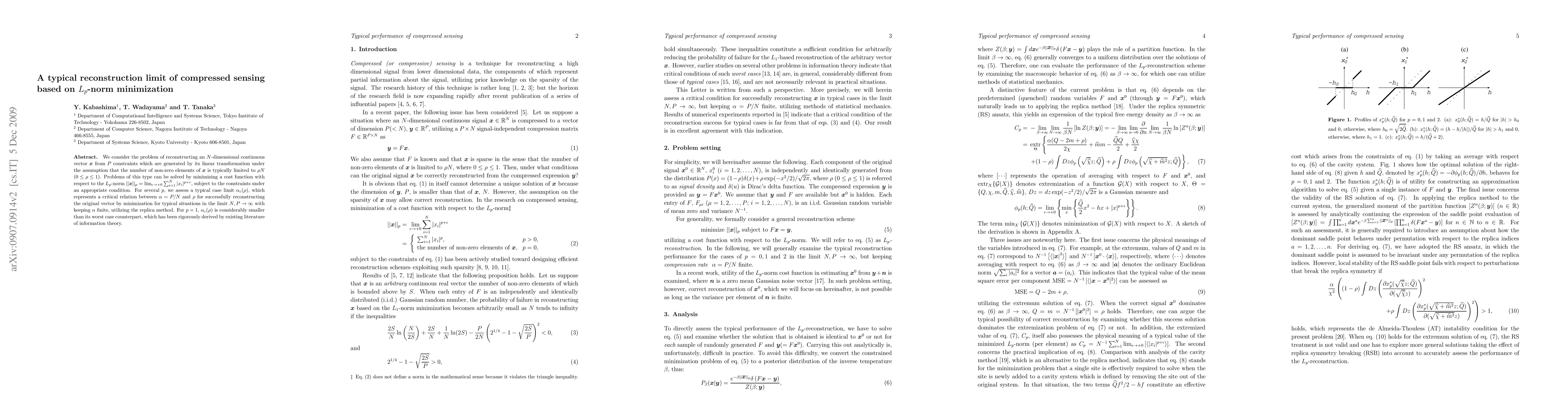 We consider the problem of reconstructing an $N$-dimensional continuous vector $\bx$ from $P$ constraints which are generated by its linear transformation under the assumption that the number of non-zero elements of $\bx$ is typically limited to $\rho N$ ($0\le \rho \le 1$). Problems of this type can be solved by minimizing a cost function with respect to the $L_p$-norm $||\bx||_p=\lim_{\epsilon \to +0}\sum_{i=1}^N |x_i|^{p+\epsilon}$, subject to the constraints under an appropriate condition. For several $p$, we assess a typical case limit $\alpha_c(\rho)$, which represents a critical relation between $\alpha=P/N$ and $\rho$ for successfully reconstructing the original vector by minimization for typical situations in the limit $N,P \to \infty$ with keeping $\alpha$ finite, utilizing the replica method. For $p=1$, $\alpha_c(\rho)$ is considerably smaller than its worst case counterpart, which has been rigorously derived by existing literature of information theory.