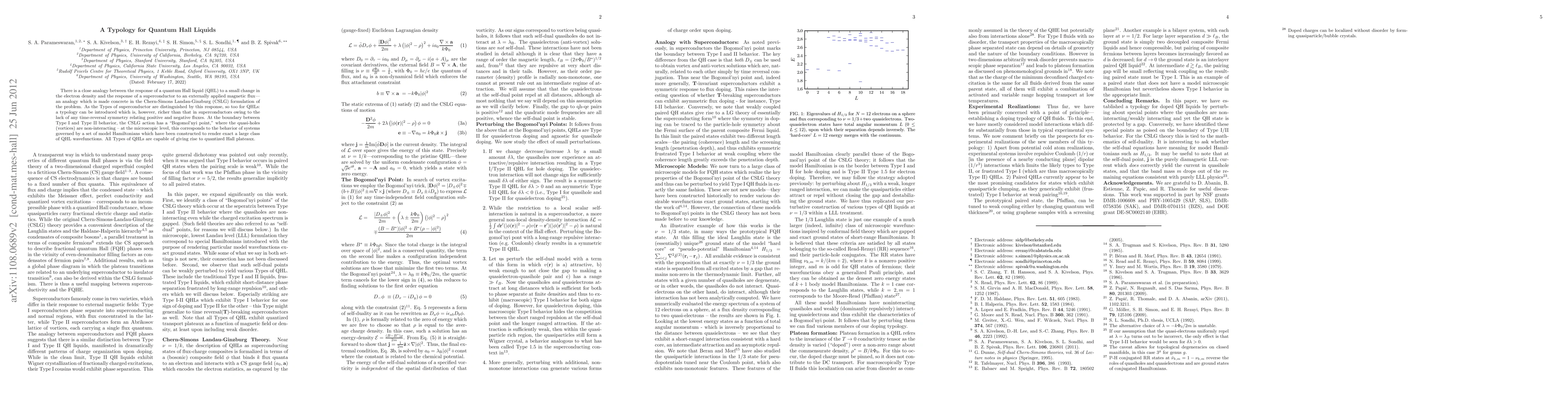 There is a close analogy between the response of a quantum Hall liquid (QHL) to a small change in the electron density and the response of a superconductor to an externally applied magnetic flux - an analogy which is made concrete in the Chern-Simons Landau-Ginzburg (CSLG) formulation of the problem. As the Types of superconductor are distinguished by this response, so too for QHLs: a typology can be introduced which is, however, richer than that in superconductors owing to the lack of any time-reversal symmetry relating positive and negative fluxes. At the boundary between Type I and Type II behavior, the CSLG action has a "Bogomol'nyi point," where the quasi-holes (vortices) are non-interacting - at the microscopic level, this corresponds to the behavior of systems governed by a set of model Hamiltonians which have been constructed to render exact a large class of QHL wavefunctions. All Types of QHLs are capable of giving rise to quantized Hall plateaux.