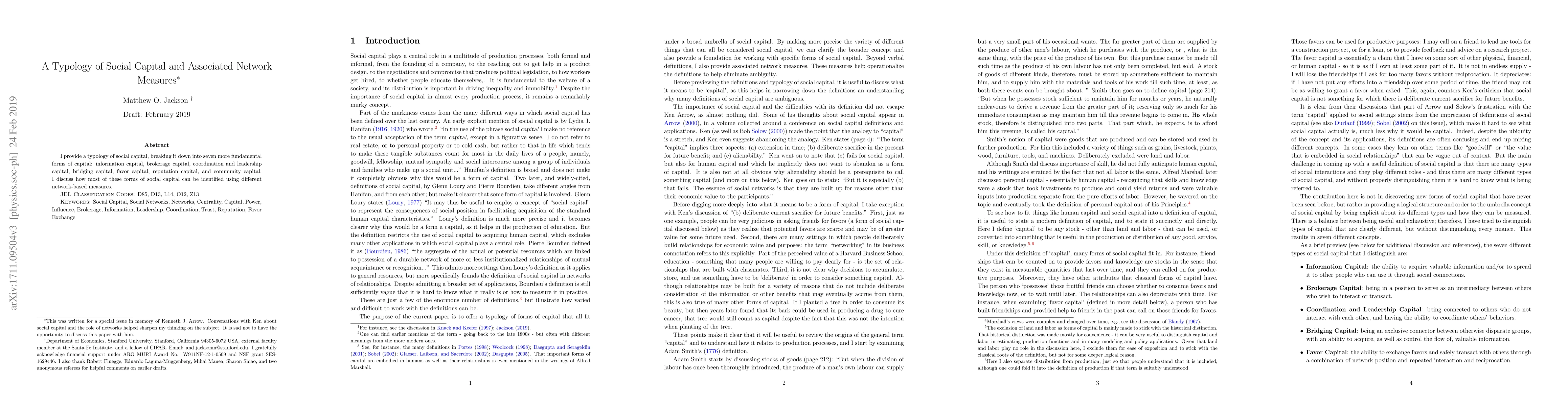 I provide a typology of social capital, breaking it down into seven more fundamental forms of capital: information capital, brokerage capital, coordination and leadership capital, bridging capital, favor capital, reputation capital, and community capital. I discuss how most of these forms of social capital can be identified using different network-based measures.