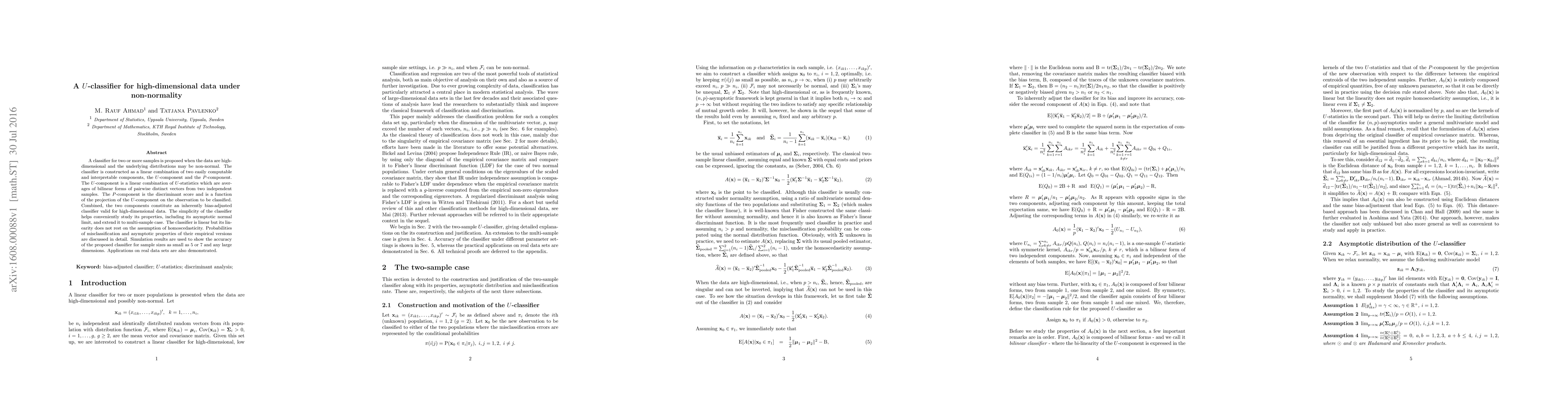 A classifier for two or more samples is proposed when the data are high-dimensional and the underlying distributions may be non-normal. The classifier is constructed as a linear combination of two easily computable and interpretable components, the $U$-component and the $P$-component. The $U$-component is a linear combination of $U$-statistics which are averages of bilinear forms of pairwise distinct vectors from two independent samples. The $P$-component is the discriminant score and is a function of the projection of the $U$-component on the observation to be classified. Combined, the two components constitute an inherently bias-adjusted classifier valid for high-dimensional data. The simplicity of the classifier helps conveniently study its properties, including its asymptotic normal limit, and extend it to multi-sample case. The classifier is linear but its linearity does not rest on the assumption of homoscedasticity. Probabilities of misclassification and asymptotic properties of their empirical versions are discussed in detail. Simulation results are used to show the accuracy of the proposed classifier for sample sizes as small as 5 or 7 and any large dimensions. Applications on real data sets are also demonstrated.