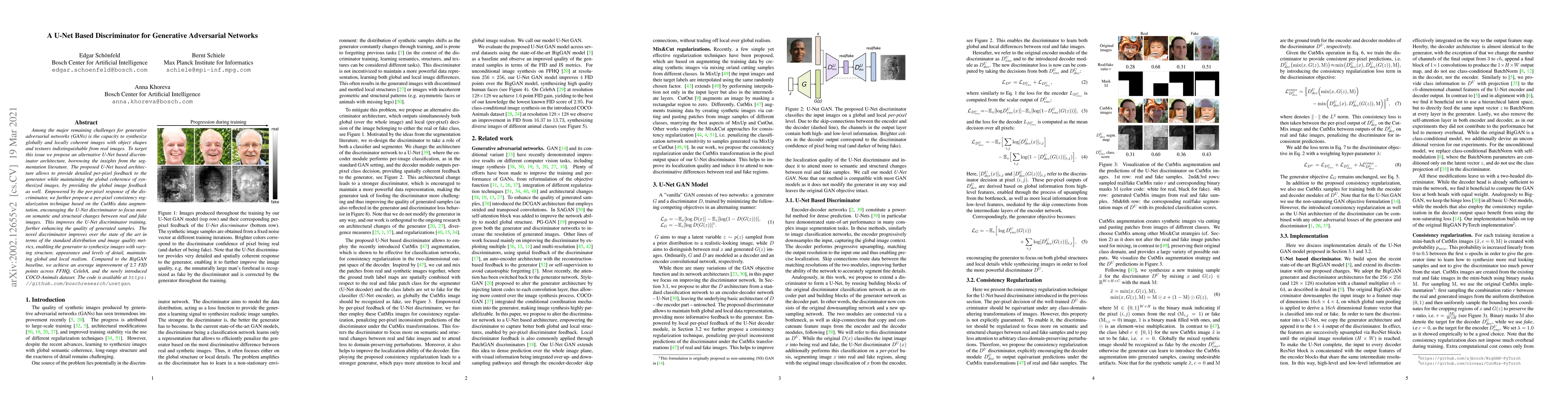 The paper proposes a U-Net based discriminator for GANs that offers detailed per-pixel feedback while maintaining global image coherence, enhanced by a per-pixel consistency regularization. This novel discriminator improves GAN performance, achieving a 2.7 FID point average improvement over BigGAN on FFHQ, CelebA, and COCO-Animals datasets.