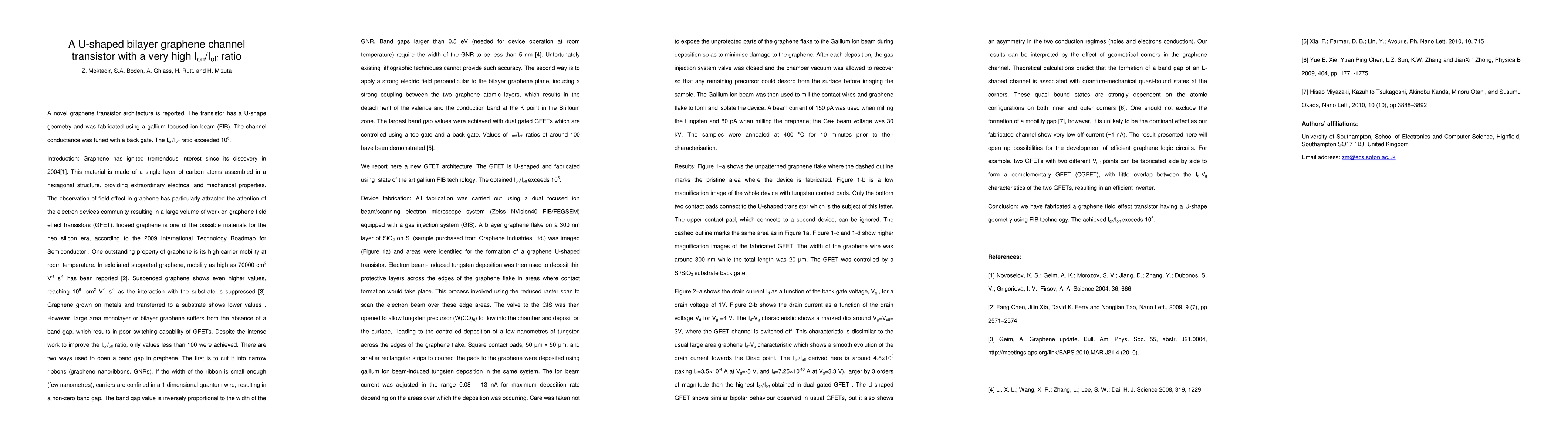 A novel graphene transistor architecture is reported. The transistor has a U-shape geometry and was fabricated using a gallium focused ion beam (FIB). The channel conductance was tuned with a back gate. The Ion/Ioff ratio exceeded 10^5.
