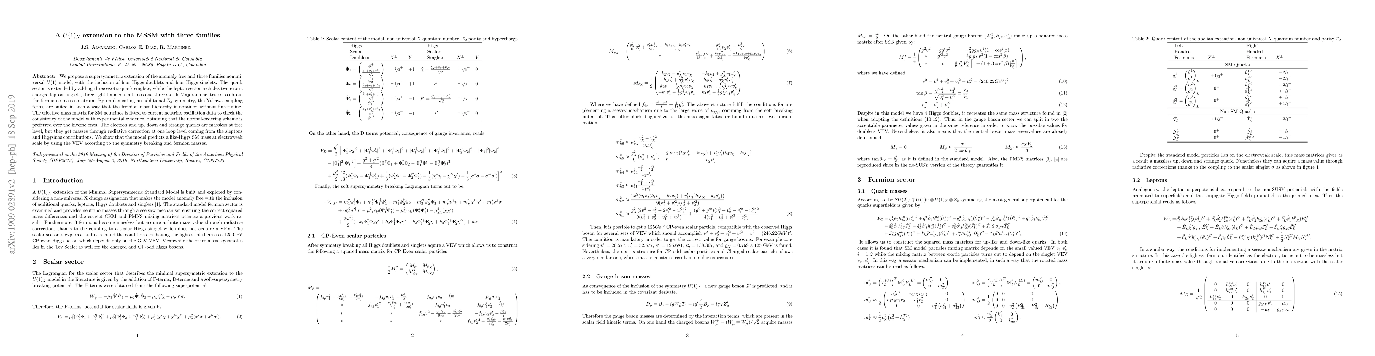 This paper proposes a supersymmetric extension of the MSSM with a $U(1)_X$ gauge symmetry, introducing four Higgs doublets and singlets, and additional exotic fermions to achieve the Standard Model mass spectrum. The model predicts a like-Higgs boson at the electroweak scale and fits well with current neutrino oscillation data, favoring the normal-ordering scheme.
