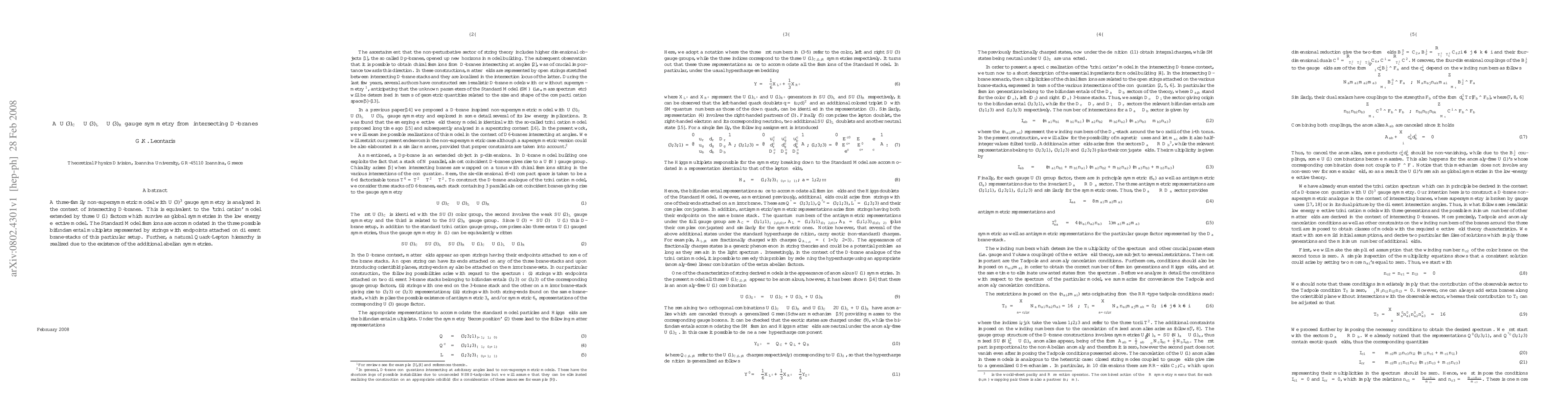 This paper explores a three-family non-supersymmetric model with U(3)^3 gauge symmetry derived from intersecting D-branes, akin to an extended trinification model with surviving U(1) factors. The Standard Model fermions are embedded in bifundamental multiplets, and a natural Quark-Lepton hierarchy emerges due to additional abelian symmetries.