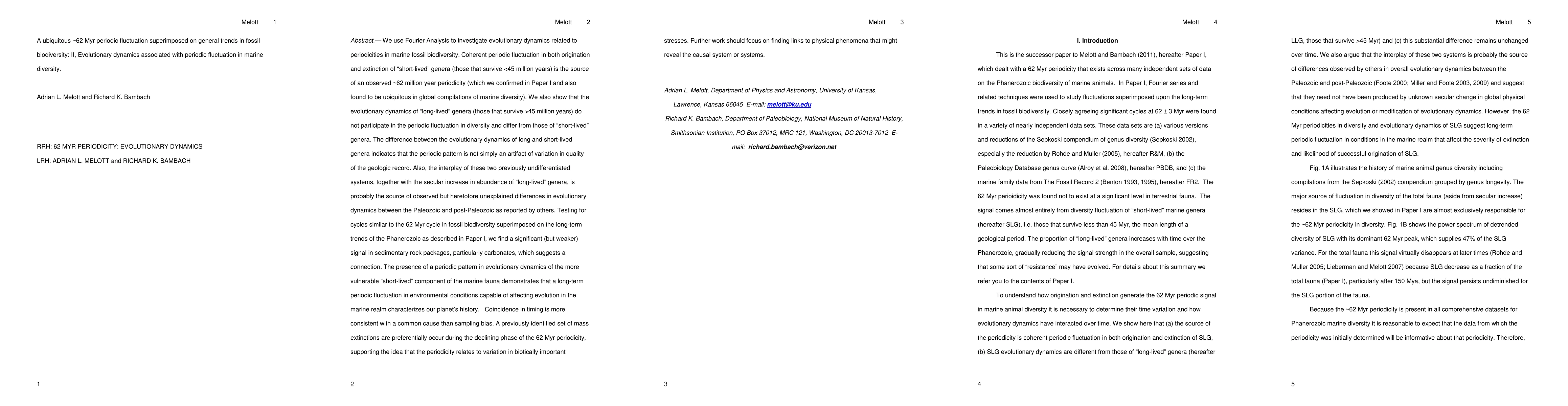 This paper explores evolutionary dynamics linked to a ~62 million-year periodic fluctuation in marine fossil biodiversity, revealing distinct dynamics between "short-lived" and "long-lived" genera. The study suggests that the periodic pattern is not an artifact of record quality and indicates a long-term environmental fluctuation affecting marine evolution.