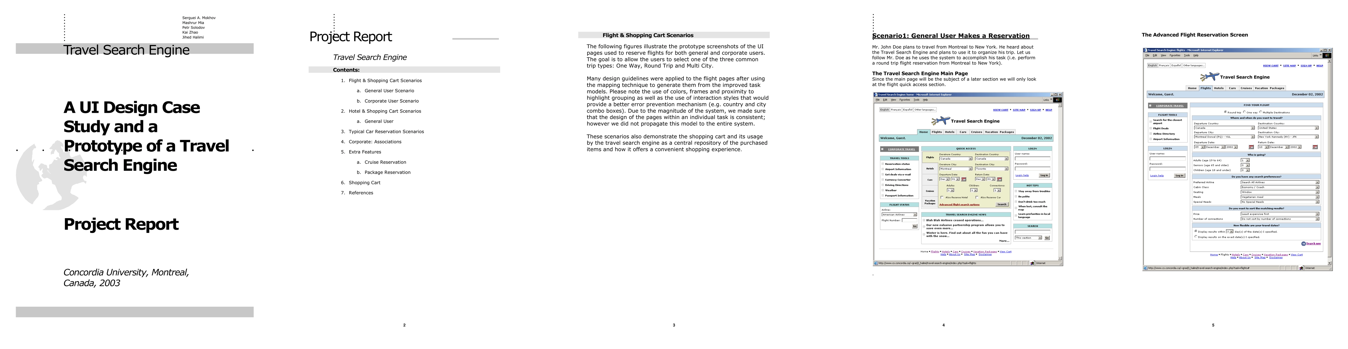 We review a case study of a UI design project for a complete travel search engine system prototype for regular and corporate users. We discuss various usage scenarios, guidelines, and so for, and put them into a web-based prototype with screenshots and the like. We combined into our prototype the best features found at the time (2002) on most travel-like sites and added more to them as a part of our research. We conducted feasibility studies, review common design guidelines and Nelson's heuristics while constructing this work. The prototype is itself open-source, but has no backend functionality, as the focus is the user-centered design of such a system. While the prototype is mostly static, some dynamic activity is present through the use of PHP.