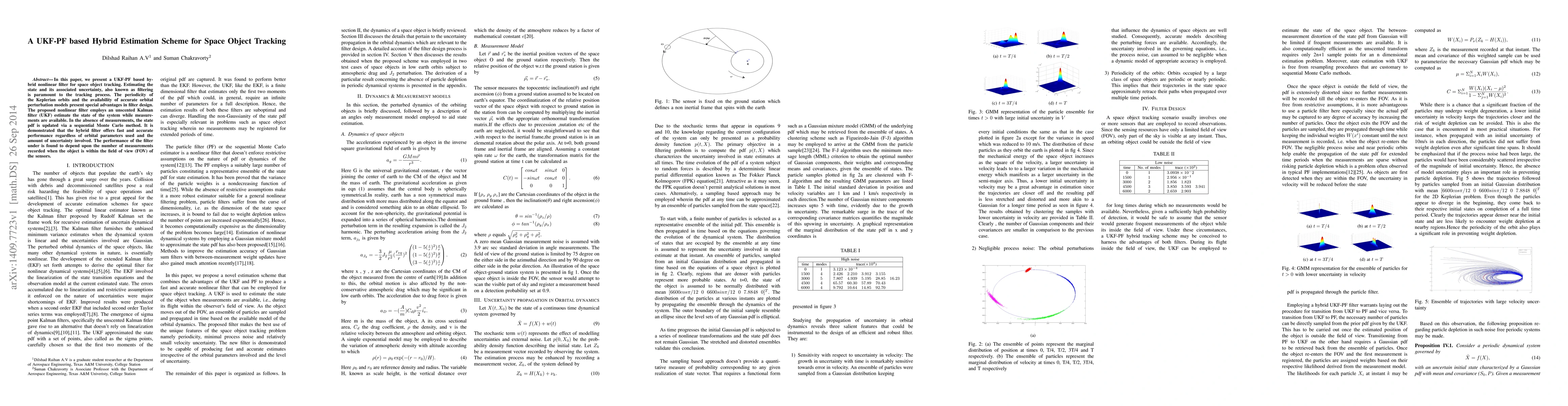 In this paper, we present a UKF-PF based hybrid nonlinear filter for space object tracking. Estimating the state and its associated uncertainty, also known as filtering is paramount to the tracking process. The periodicity of the Keplerian orbits and the availability of accurate orbital perturbation models present special advantages in filter design. The proposed nonlinear filter employs an unscented Kalman filter (UKF) estimate the state of the system while measurements are available. In the absence of measurements, the state pdf is updated via a sequential Monte Carlo method. It is demonstrated that the hybrid filter offers fast and accurate performance regardless of orbital parameters used and the amount of uncertainty involved. The performance of the filter under is found to depend upon the number of measurements recorded when the object is within the field of view (FOV) of the sensors.