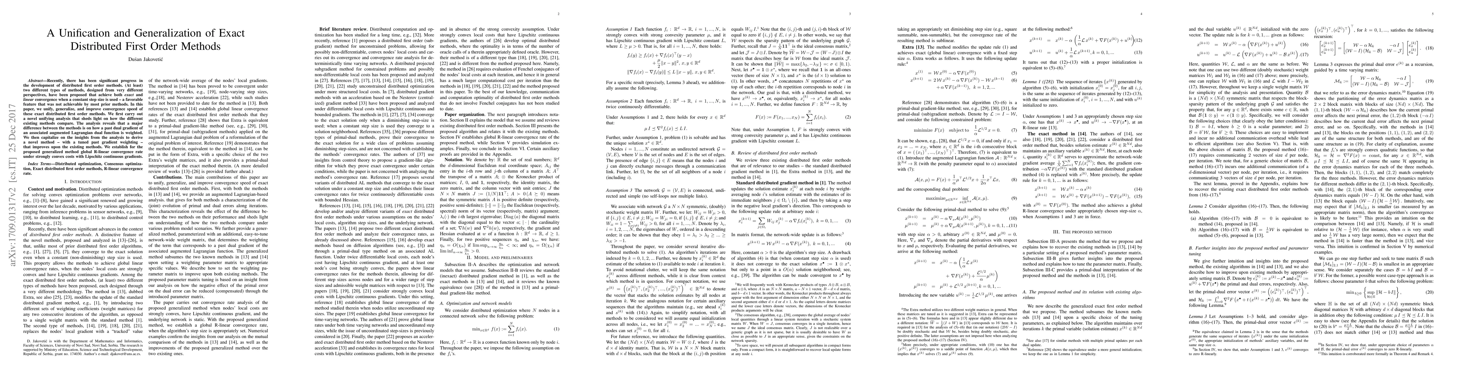Recently, there has been significant progress in the development of distributed first order methods. (At least) two different types of methods, designed from very different perspectives, have been proposed that achieve both exact and linear convergence when a constant step size is used -- a favorable feature that was not achievable by most prior methods. In this paper, we unify, generalize, and improve convergence speed of these exact distributed first order methods. We first carry out a novel unifying analysis that sheds light on how the different existing methods compare. The analysis reveals that a major difference between the methods is on how a past dual gradient of an associated augmented Lagrangian dual function is weighted. We then capitalize on the insights from the analysis to derive a novel method -- with a tuned past gradient weighting -- that improves upon the existing methods. We establish for the proposed generalized method global R-linear convergence rate under strongly convex costs with Lipschitz continuous gradients.