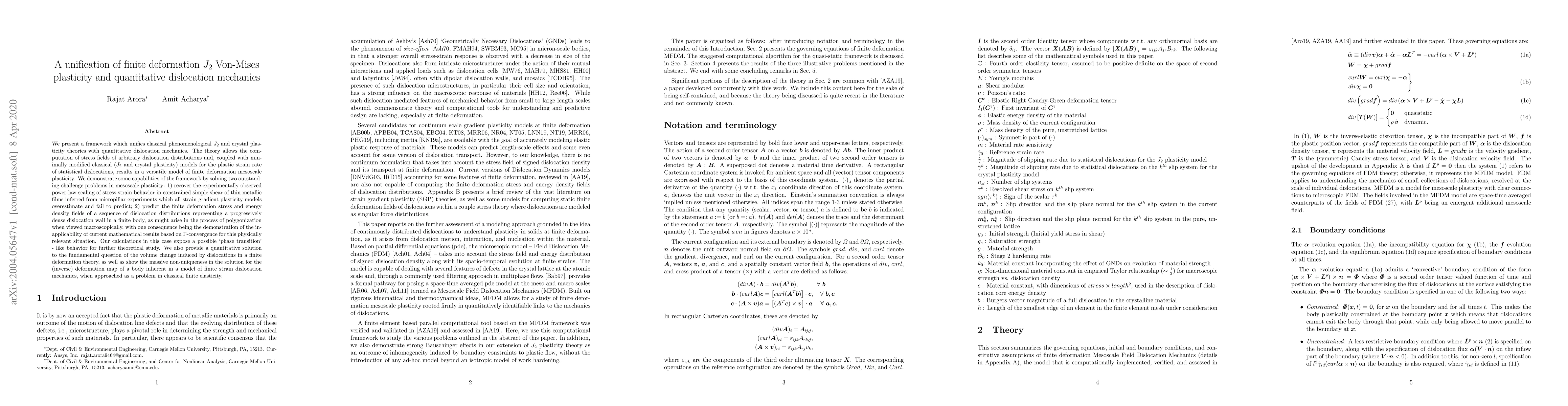 This paper presents a unified framework for finite deformation plasticity that integrates $J_2$ Von-Mises plasticity and quantitative dislocation mechanics, enabling accurate stress field computations and addressing challenges in mesoscale plasticity, including the power-law scaling in thin metallic films and the stress fields in dense dislocation walls.