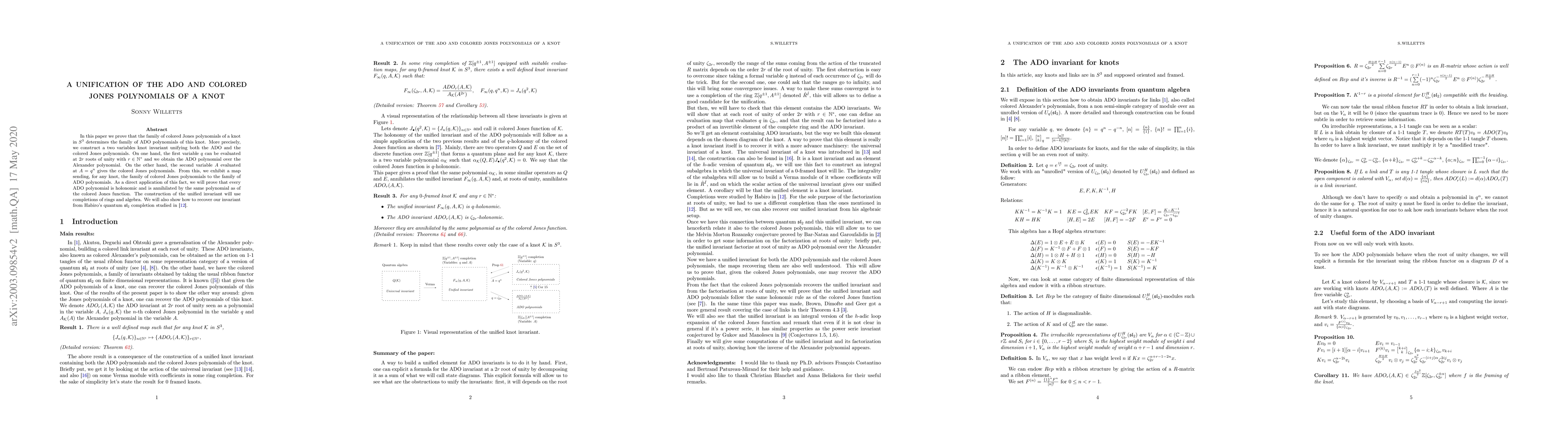 This paper establishes a unifying two-variable knot invariant that combines ADO and colored Jones polynomials. It demonstrates that colored Jones polynomials determine ADO polynomials, showing that every ADO polynomial is q-holonomic and shares the same annihilating polynomials as colored Jones functions.