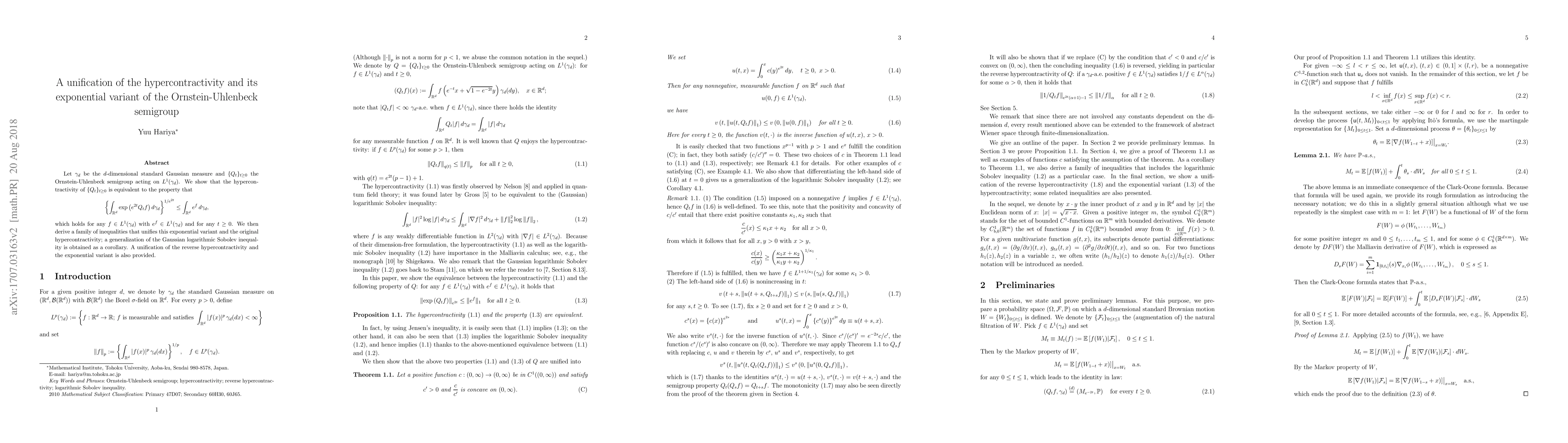 This paper demonstrates the equivalence between the hypercontractivity of the Ornstein-Uhlenbeck semigroup and an exponential variant, and derives a unified family of inequalities that encompass both properties. The result includes a generalized Gaussian logarithmic Sobolev inequality as a corollary.