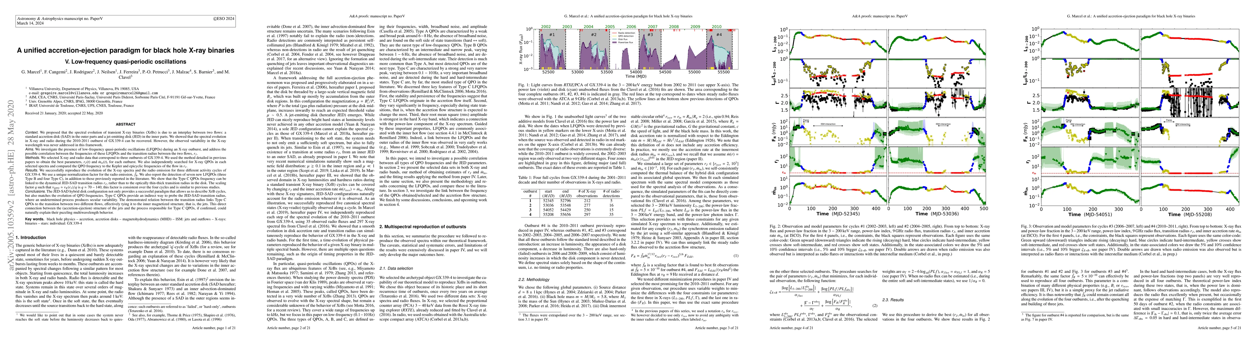 We proposed that the spectral evolution of transient X-ray binaries (XrB) is due to an interplay between two flows: a standard accretion disk (SAD) in the outer parts and a jet-emitting disk (JED) in the inner parts. We showed in previous papers that the spectral evolution in X-ray and radio during the 2010-2011 outburst of GX339-4 can be recovered. We now investigate the presence of low frequency quasi-periodic oscillations (LFQPOs) during an X-ray outburst, and address the possible correlation between the frequencies of these LFQPOs and the transition radius between the two flows, rJ. We select X-ray and radio data form 3 outbursts of GX339-4. We use the method detailed in paper IV to obtain $r_J(t)$ and $\dot{m}_{in}(t)$ for each outburst to reproduce the correlated evolution of the X-ray spectra and the radio emission for 3 different activity cycles of GX339-4. We also independently search and report the detection of 7 new LFQPOs in addition to the literature. We show that the frequency of Type C QPOs can be linked to the dynamical JED-SAD transition radius rJ, rather than the radius of optically thin-thick transition. The scaling factor q such that $\nu_{QPO} \simeq \nu_K (r_J) / q$ is $q \simeq 70-140$, consistent during the 4 cycles and similar to previous studies. The JED-SAD hybrid disk configuration not only provides a successful paradigm allowing us to describe XrB cycles, but also matches the QPO frequencies evolution. QPOs provide an indirect way to probe the JED-SAD transition radius, where an undetermined process produces secular variability. The demonstrated relation between the transition radius links Type C QPOs to the transition between the two flows, tying it to the inner magnetized structure of the jets. This direct connection between the jets' structure and the process responsible for Type C QPOs could naturally explain their puzzling multi-wavelength behavior.