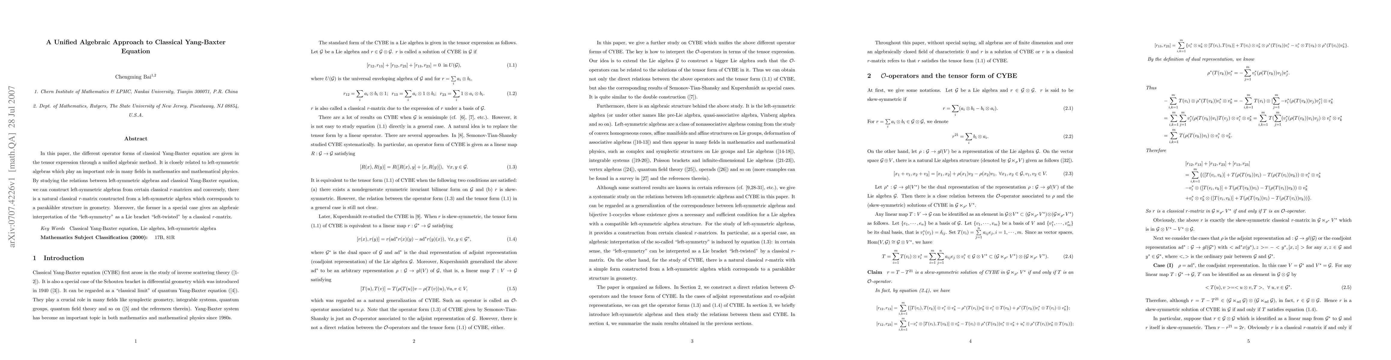 This paper presents a unified algebraic approach to the classical Yang-Baxter equation using tensor expressions, linking it closely to left-symmetric algebras. It constructs left-symmetric algebras from classical r-matrices and vice versa, revealing a parakähler structure in geometry.
