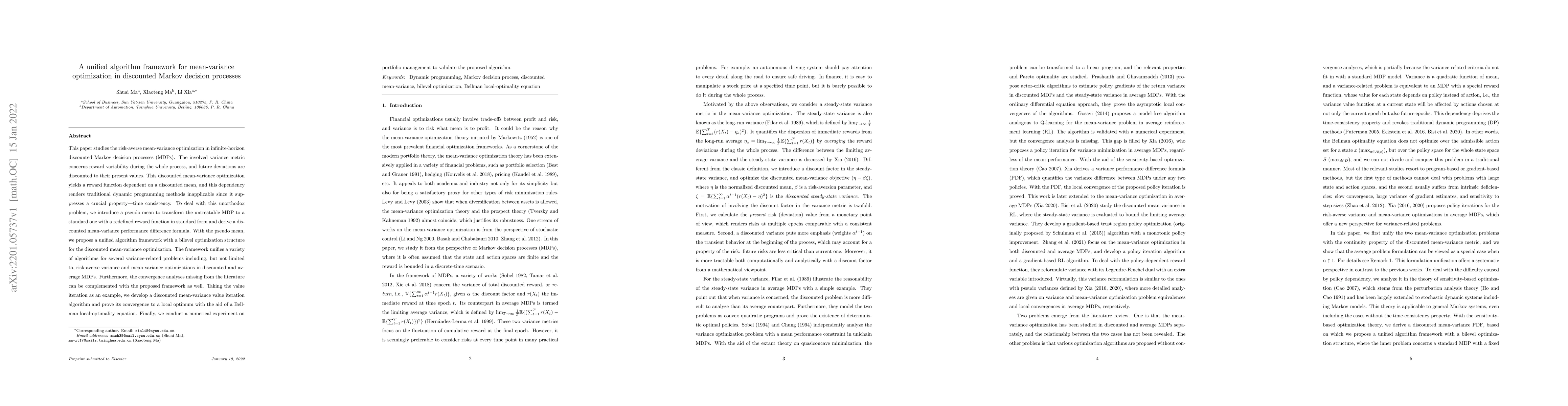 This paper proposes a unified algorithm framework for mean-variance optimization in discounted Markov decision processes, addressing the challenge of time inconsistency in traditional dynamic programming methods. It introduces a pseudo mean to transform the problem into a standard form and develops a bilevel optimization structure, unifying various variance-related optimizations and proving the convergence of the proposed discounted mean-variance value iteration algorithm.