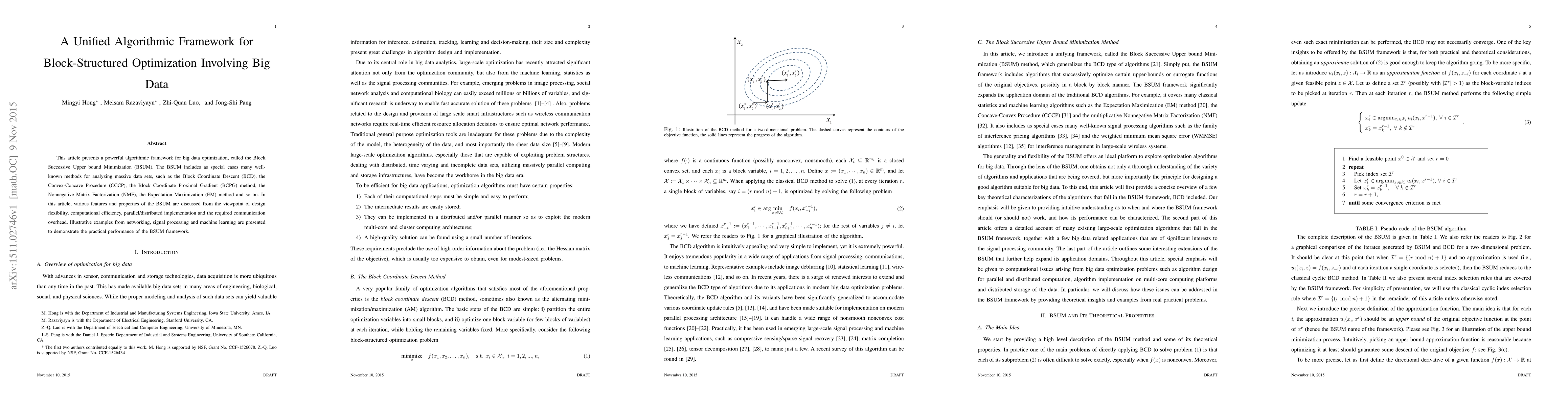 This article presents a powerful algorithmic framework for big data optimization, called the Block Successive Upper bound Minimization (BSUM). The BSUM includes as special cases many well-known methods for analyzing massive data sets, such as the Block Coordinate Descent (BCD), the Convex-Concave Procedure (CCCP), the Block Coordinate Proximal Gradient (BCPG) method, the Nonnegative Matrix Factorization (NMF), the Expectation Maximization (EM) method and so on. In this article, various features and properties of the BSUM are discussed from the viewpoint of design flexibility, computational efficiency, parallel/distributed implementation and the required communication overhead. Illustrative examples from networking, signal processing and machine learning are presented to demonstrate the practical performance of the BSUM framework