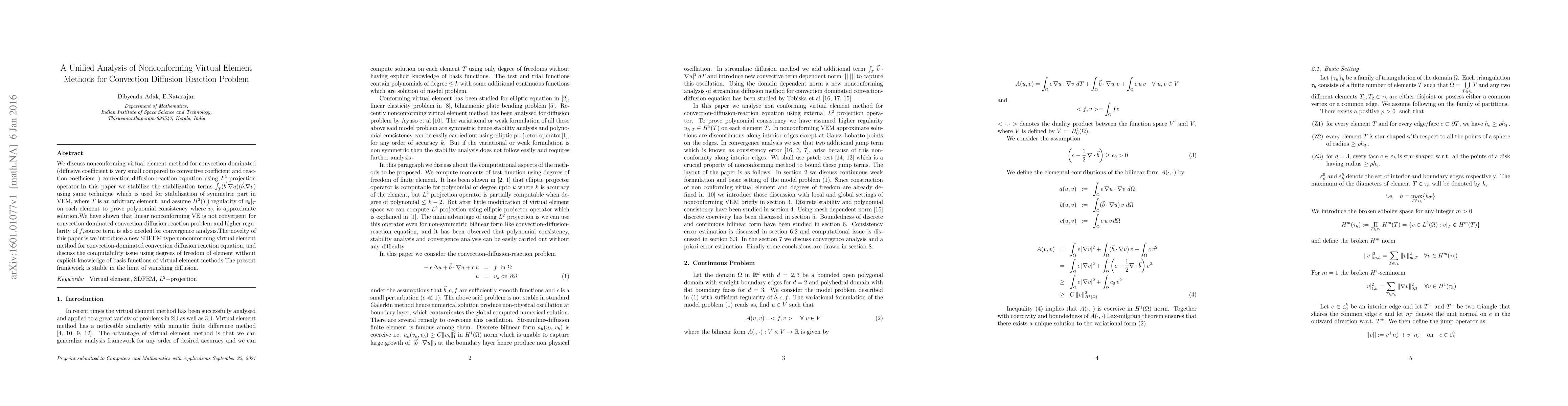 We discuss nonconforming virtual element method for convection dominated (diffusive coefficient is very small compared to convective coefficient and reac- tion coefficient ) convection-diffusion-reaction equation using L^2 projection operator.In this paper we stabilize the stabilization terms using same technique which is used for stabilization of symmetric part in VEM, where T is an arbitrary element, and assume H^2(T) regularity on each element to prove polynomial consistency where v_h is approximate solution.We have shown that linear nonconforming VE is not convergent for convection dominated convection-diffusion reaction problem and higher regu larity of f ,source term is also needed for convergence analysis.The novelty of this paper is we introduce a new SDFEM type nonconforming virtual element method for convection-dominated convection diffusion reaction equation, and discuss the computability issue using degrees of freedom of element without explicit knowledge of basis functions of virtual element methods.The present framework is stable in the limit of vanishing diffusion.