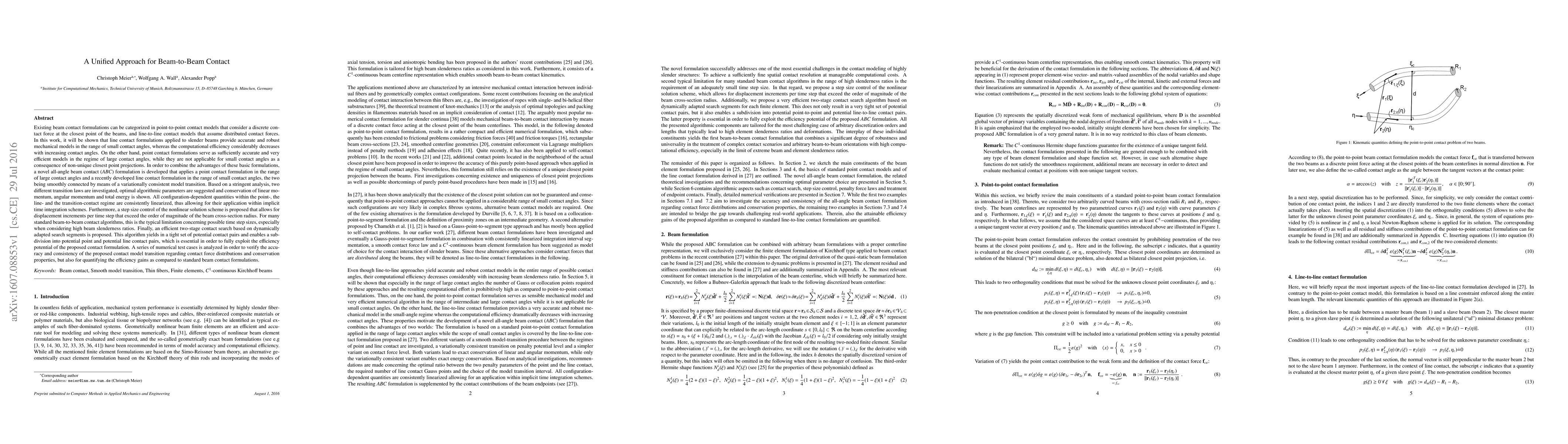 Existing beam contact formulations can be categorized in point contact models that consider a discrete contact force at the closest point of the beams, and line contact models that assume distributed contact forces. In this work, it will be shown that line contact formulations provide accurate and robust mechanical models in the range of small contact angles, whereas the computational efficiency considerably decreases with increasing contact angles. On the other hand, point contact formulations serve as sufficiently accurate and very efficient models in the regime of large contact angles, while they are not applicable for small contact angles as a consequence of non-unique closest point projections. In order to combine the advantages of these basic formulations, a novel all-angle beam contact (ABC) formulation is developed that applies a point contact formulation for large contact angles and a recently developed line contact formulation for small contact angles, the two being smoothly connected by means of a variationally consistent model transition. Based on a stringent analysis, two different transition laws are investigated, optimal algorithmic parameters are suggested and conservation of energy and momentum is shown. All configuration-dependent quantities are consistently linearized, thus allowing for their application within implicit time integration schemes. Furthermore, a step size control of the nonlinear solution scheme that allows for large displacement increments per time step and an efficient two-stage contact search based on dynamically adapted search segments are proposed. A series of numerical test cases is analyzed in order to verify the accuracy and consistency of the proposed contact model transition regarding contact force distributions and conservation properties, but also for quantifying the efficiency gains as compared to standard beam contact formulations.