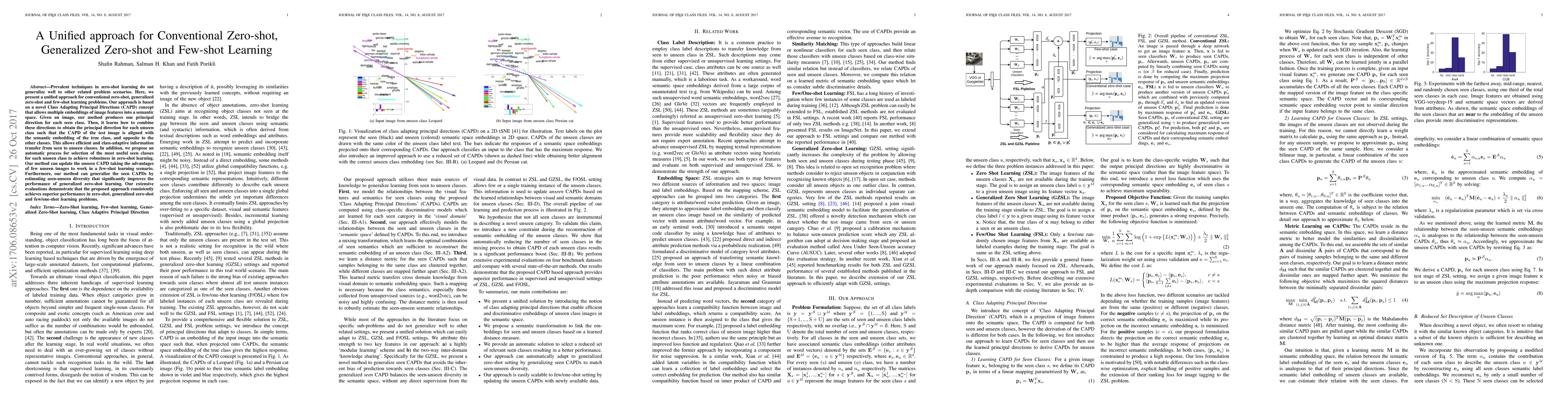 This paper proposes a unified framework for zero-shot, generalized zero-shot, and few-shot learning based on a novel Class Adapting Principal Directions (CAPD) concept, achieving superior performance by efficiently transferring information from seen to unseen classes and adapting to limited data scenarios. The method also incorporates an automatic selection of relevant seen classes for robustness.