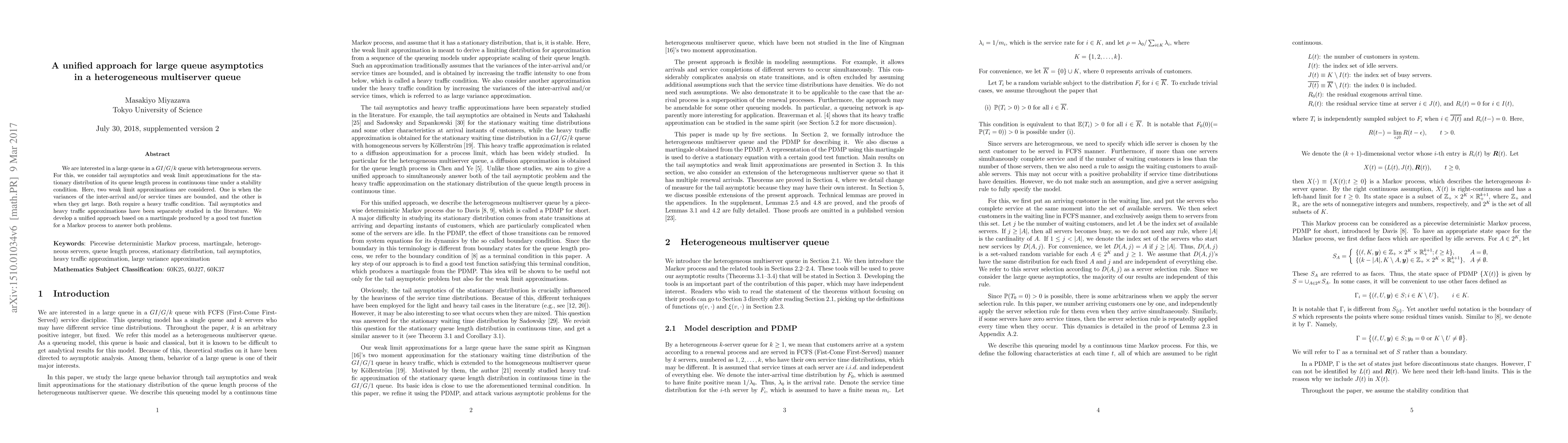 This paper presents a unified approach for analyzing large queue asymptotics in a heterogeneous $GI/G/k$ multiserver queue, focusing on tail asymptotics and weak limit approximations under stability conditions. It combines two scenarios: bounded and large variances of inter-arrival and service times, both requiring a heavy traffic condition, using a martingale method.