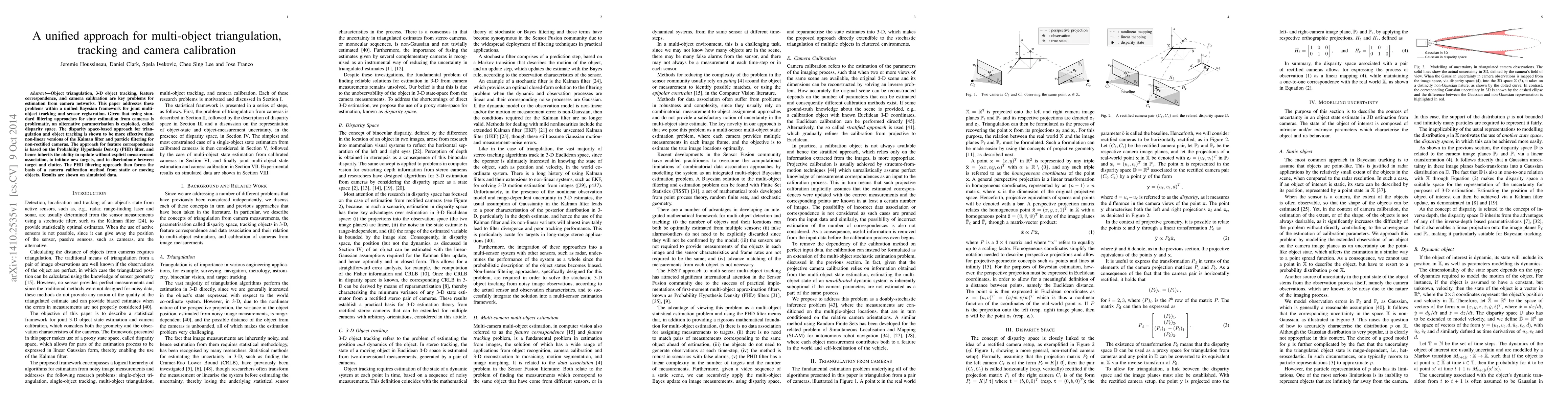 This paper presents a unified Bayesian framework for multi-object triangulation, tracking, and camera calibration using a disparity space-based approach. It demonstrates superior performance over traditional Kalman and particle filtering methods, and employs the Probability Hypothesis Density (PHD) filter for effective feature correspondence and camera calibration.