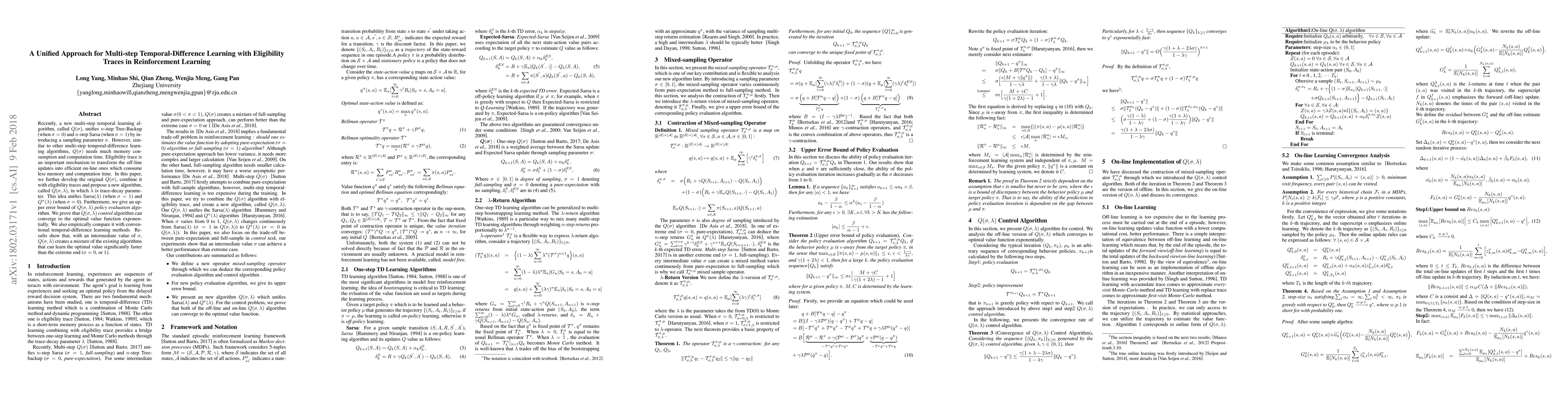 This paper proposes a new reinforcement learning algorithm, $Q(\sigma, \lambda)$, which combines a multi-step temporal-difference learning approach with eligibility traces to reduce memory and computation costs. The algorithm unifies existing methods and demonstrates faster convergence to the optimal value function compared to traditional temporal-difference learning techniques.