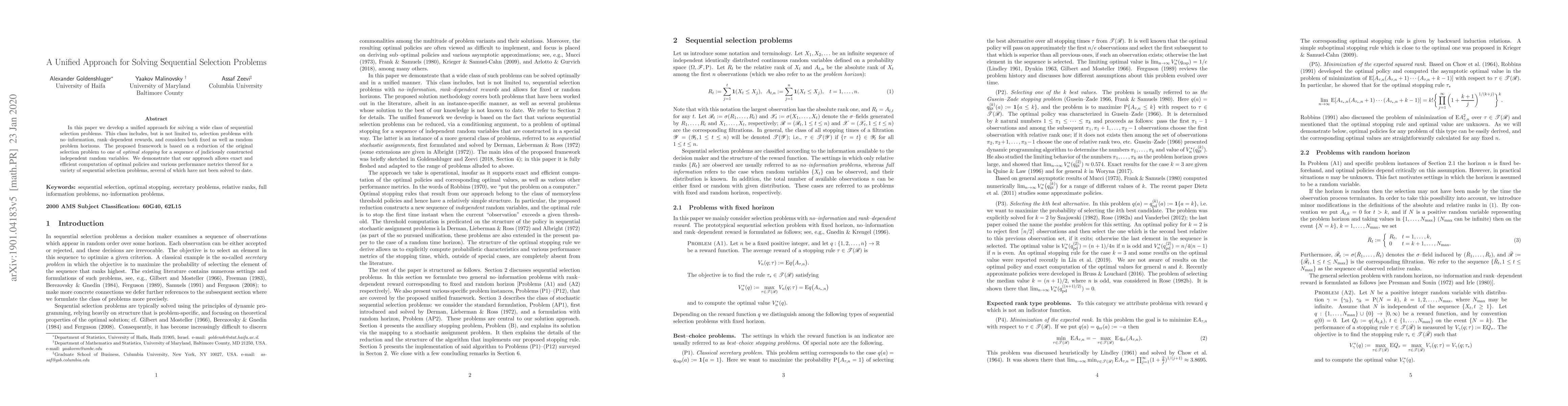 This paper presents a unified framework for solving diverse sequential selection problems by reducing them to optimal stopping problems for constructed random variables, enabling efficient computation of optimal policies and performance metrics. The approach addresses previously unsolved problems within the class.