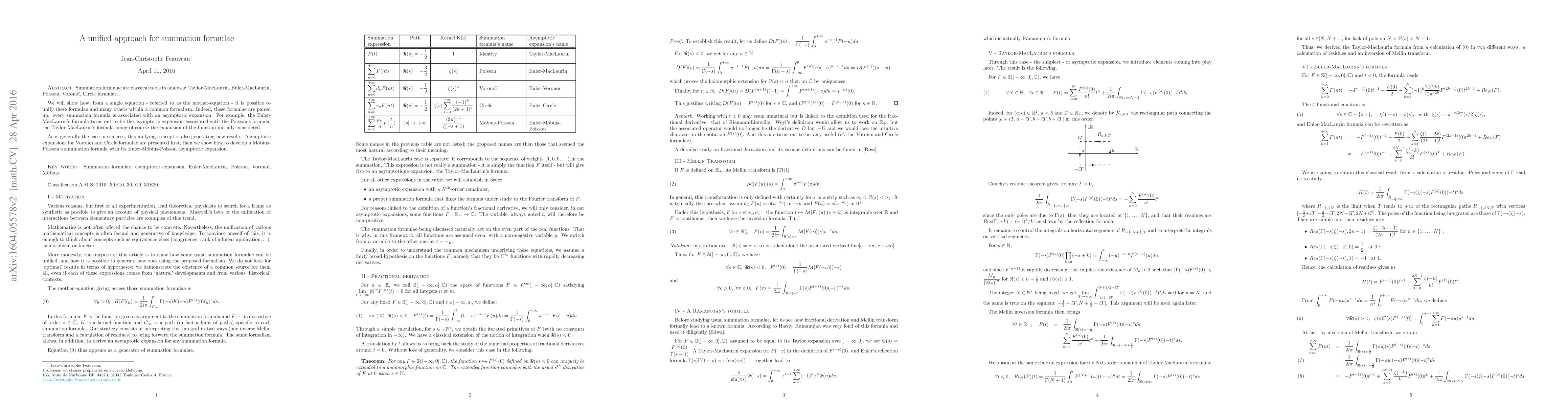 The paper presents a unified approach for summation formulae by deriving them from a single 'mother-equation', linking summation formulae with asymptotic expansions.