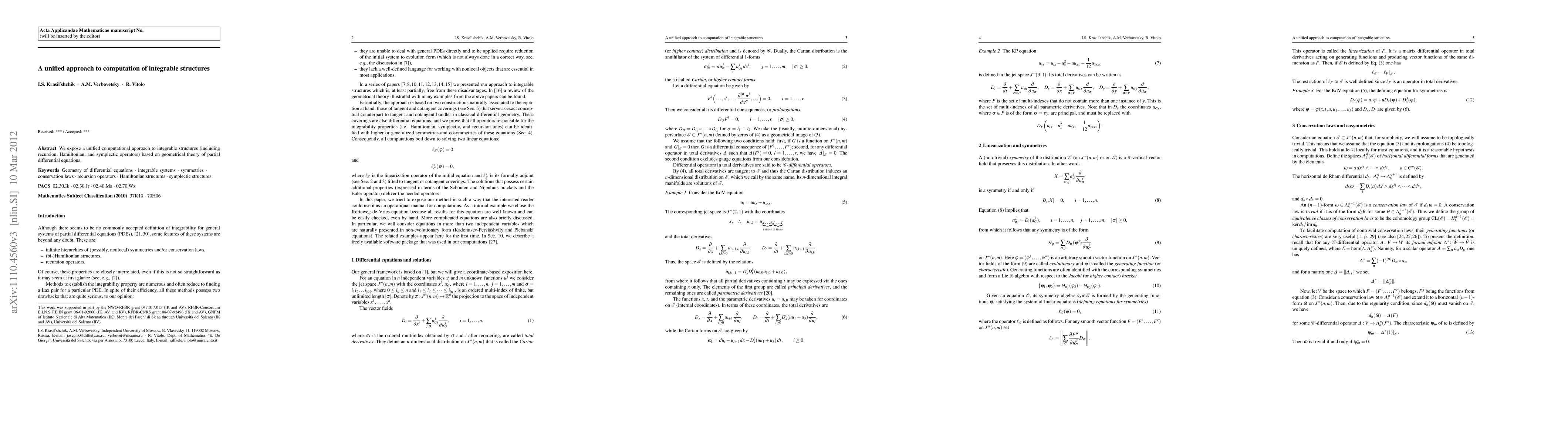 We expose (without proofs) a unified computational approach to integrable structures (including recursion, Hamiltonian, and symplectic operators) based on geometrical theory of partial differential equations. We adopt a coordinate based approach and aim to provide a tutorial to the computations.