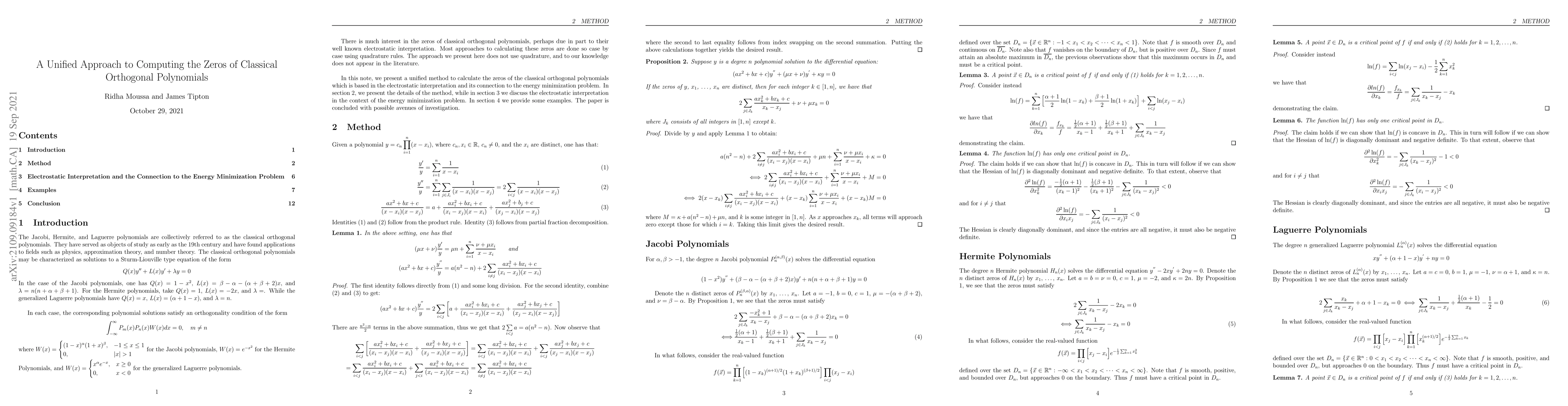 This paper introduces a unified method for computing the zeros of classical orthogonal polynomials using electrostatic interpretations linked to energy minimization, providing error estimates for Jacobi, Laguerre, and Hermite polynomials, and exact errors for Chebyshev polynomials.