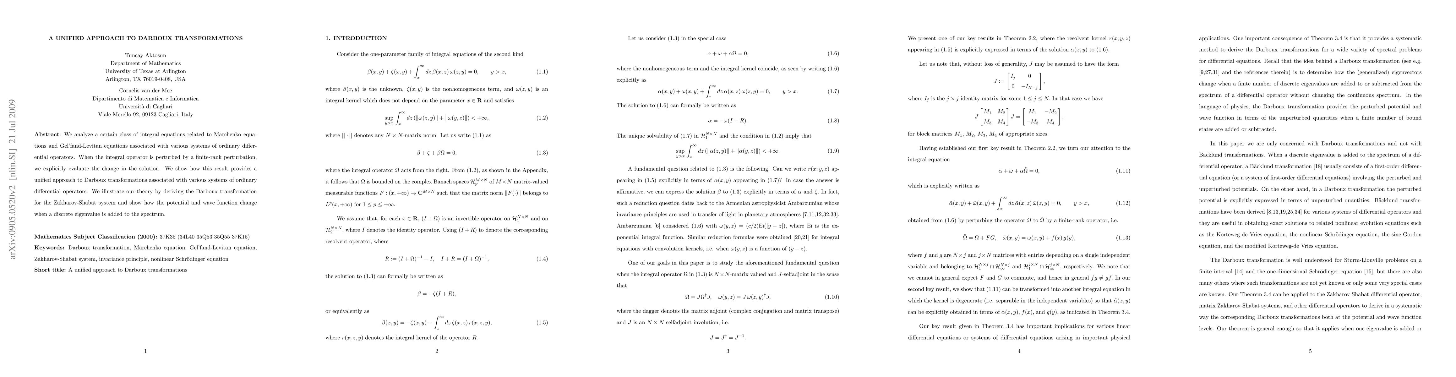 We analyze a certain class of integral equations related to Marchenko equations and Gel'fand-Levitan equations associated with various systems of ordinary differential operators. When the integral operator is perturbed by a finite-rank perturbation, we explicitly evaluate the change in the solution. We show how this result provides a unified approach to Darboux transformations associated with various systems of ordinary differential operators. We illustrate our theory by deriving the Darboux transformation for the Zakharov-Shabat system and show how the potential and wave function change when a discrete eigenvalue is added to the spectrum.