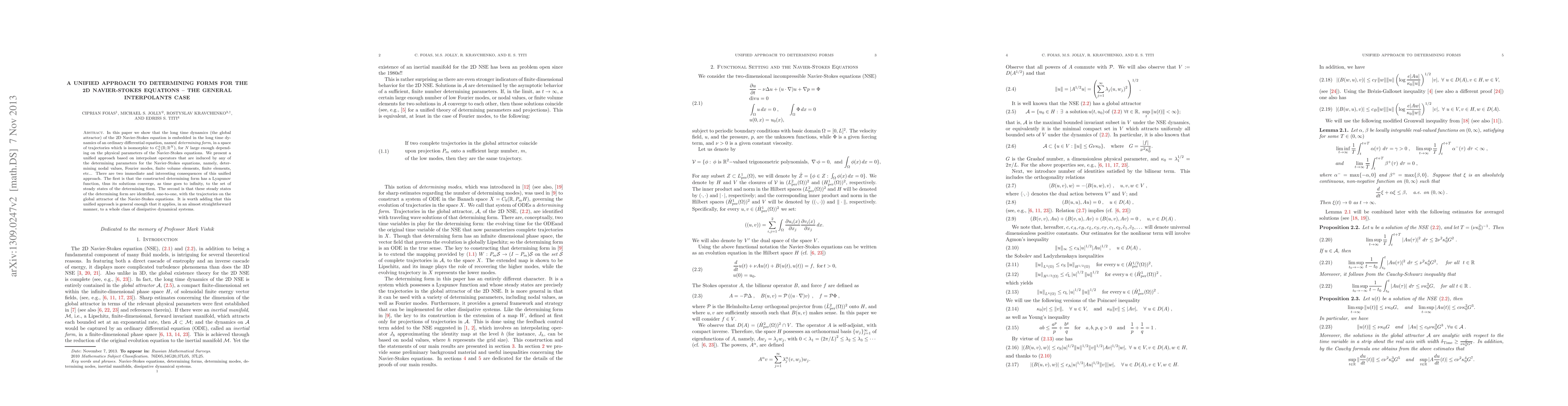 In this paper we show that the long time dynamics (the global attractor) of the 2D Navier-Stokes equation is embedded in the long time dynamics of an ordinary differential equation, named {\it determining form}, in a space of trajectories which is isomorphic to $C^1_b(\bR; \bR^N)$, for $N$ large enough depending on the physical parameters of the Navier-Stokes equations. We present a unified approach based on interpolant operators that are induced by any of the determining parameters for the Navier-Stokes equations, namely, determining nodal values, Fourier modes, finite volume elements, finite elements, etc... There are two immediate and interesting consequences of this unified approach. The first is that the constructed determining form has a Lyapunov function, thus its solutions converge, as time goes to infinity, to the set of steady states of the determining form. The second is that these steady states of the determining form are identified, one-to-one, with the trajectories on the global attractor of the Navier-Stokes equations. It is worth adding that this unified approach is general enough that it applies, in an almost straightforward manner, to a whole class of dissipative dynamical systems.