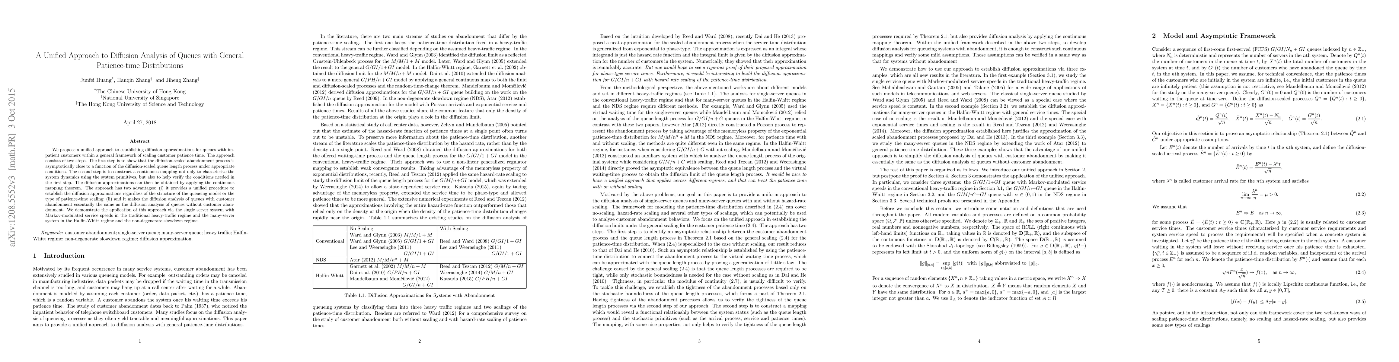 We propose a unified approach to establishing diffusion approximations for queues with impatient customers within a general framework of scaling customer patience time. The approach consists of two steps. The first step is to show that the diffusion-scaled abandonment process is asymptotically close to a function of the diffusion-scaled queue length process under appropriate conditions. The second step is to construct a continuous mapping not only to characterize the system dynamics using the system primitives, but also to help verify the conditions needed in the first step. The diffusion approximations can then be obtained by applying the continuous mapping theorem. The approach has two advantages: (i) it provides a unified procedure to establish the diffusion approximations regardless of the structure of the queueing model or the type of patience-time scaling; (ii) and it makes the diffusion analysis of queues with customer abandonment essentially the same as the diffusion analysis of queues without customer abandonment. We demonstrate the application of this approach via the single server system with Markov-modulated service speeds in the traditional heavy-traffic regime and the many-server system in the Halfin-Whitt regime and the non-degenerate slowdown regime.