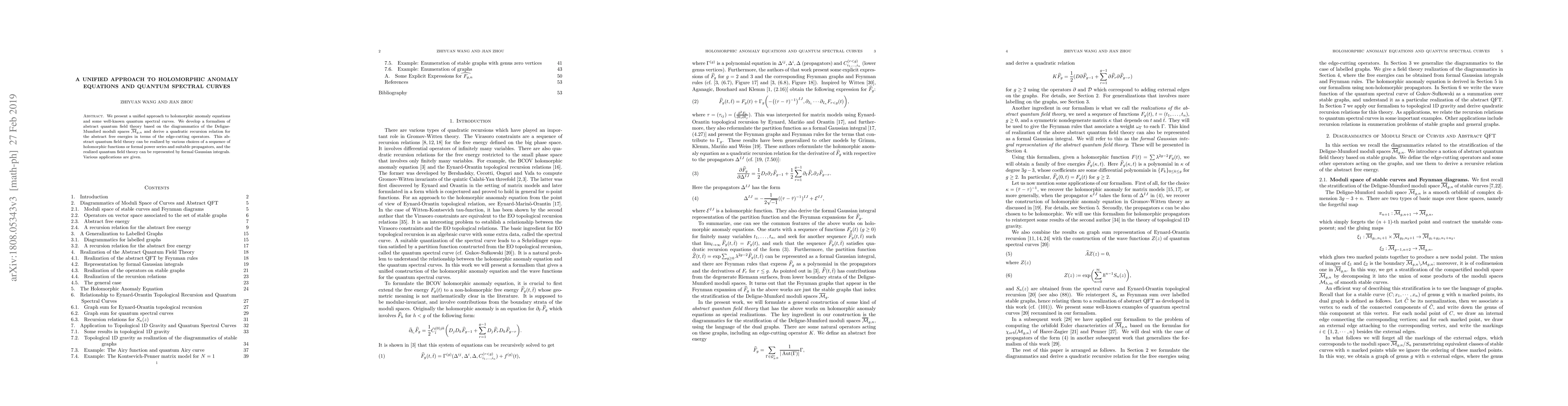 This paper proposes a unified framework linking holomorphic anomaly equations and quantum spectral curves through an abstract quantum field theory utilizing diagrammatics of Deligne-Mumford moduli spaces, resulting in a quadratic recursion relation for free energies. This theoretical framework is realized via holomorphic functions or series and represented by Gaussian integrals.