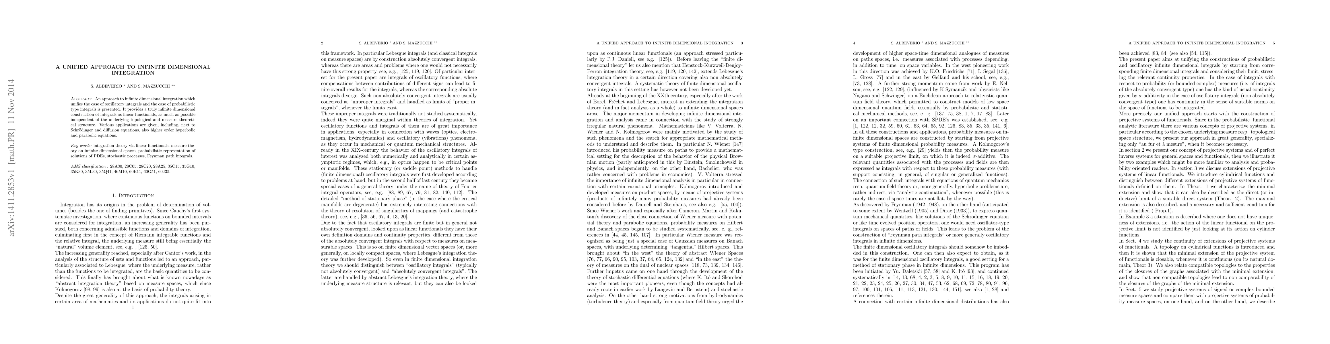 This paper presents a unified method for infinite dimensional integration that combines oscillatory and probabilistic integrals, constructing them as linear functionals independent of specific topological and measure structures. Applications include Schrödinger, diffusion, and higher order hyperbolic and parabolic equations.