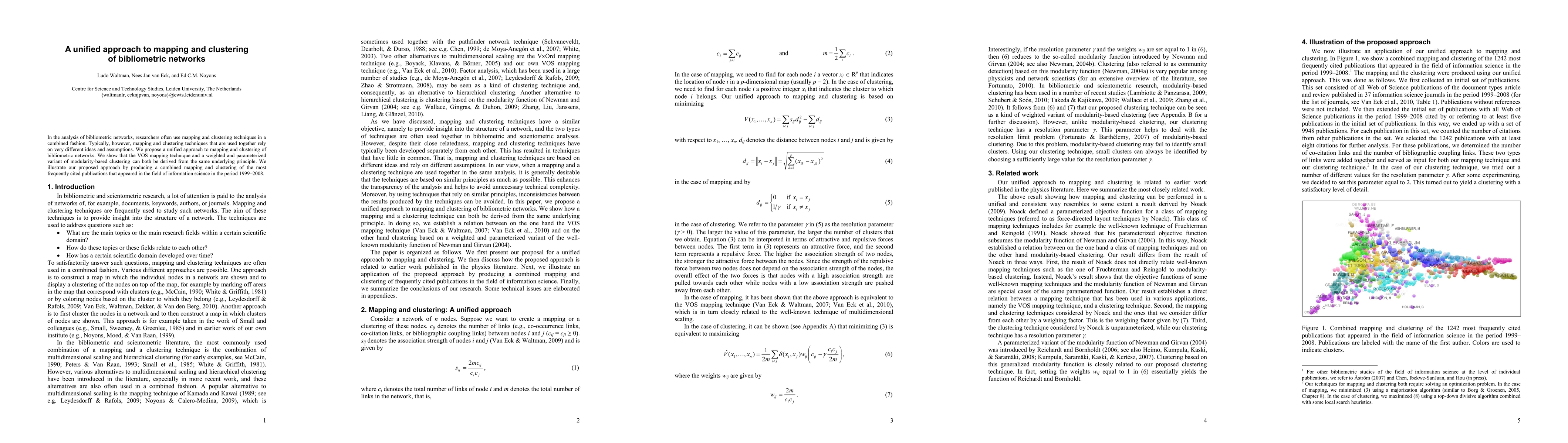 This paper proposes a unified approach to mapping and clustering bibliometric networks, demonstrating that the VOS mapping technique and a modified modularity-based clustering can both stem from a common principle. The authors apply this approach to analyze and visualize the most cited publications in information science from 1999-2008.