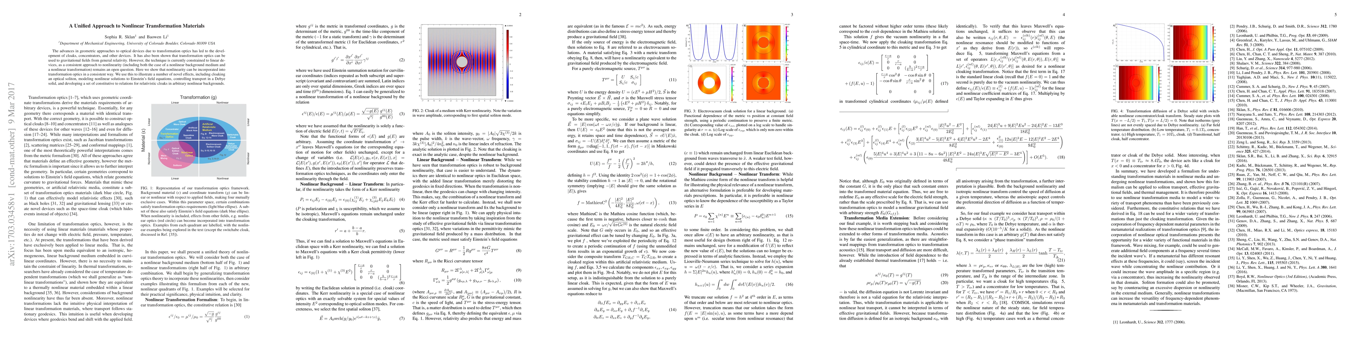 Researchers have developed a unified approach to incorporating nonlinearity into transformation optics, enabling novel effects like cloaking optical solitons and controlling transport in Debye solids, with implications for general relativity and relativistic cloaks.