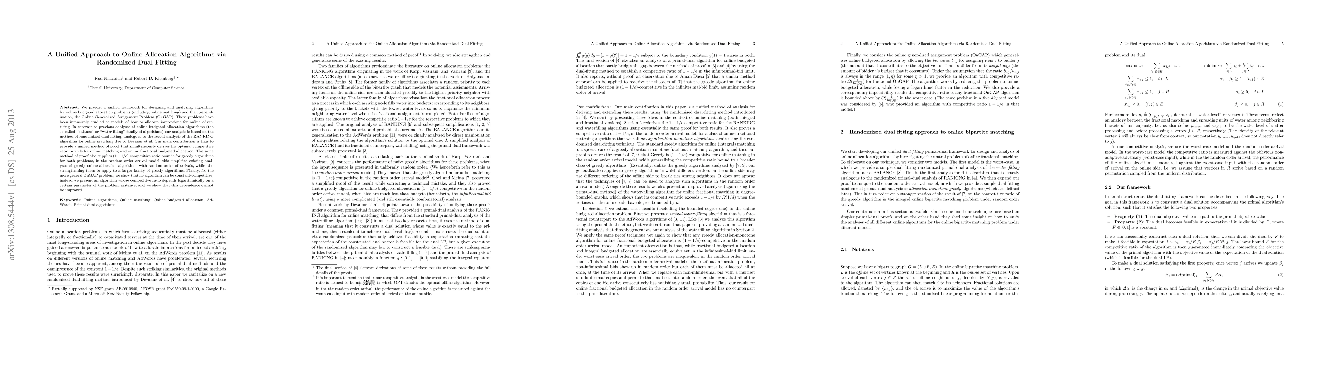 We present a unified framework for designing and analyzing algorithms for online budgeted allocation problems (including online matching) and their generalization, the Online Generalized Assignment Problem (OnGAP). These problems have been intensively studied as models of how to allocate impressions for online advertising. In contrast to previous analyses of online budgeted allocation algorithms (the so-called "balance" or "water-filling" family of algorithms) our analysis is based on the method of randomized dual fitting, analogous to the recent analysis of the RANKING algorithm for online matching due to Devanur et al. Our main contribution is thus to provide a unified method of proof that simultaneously derives the optimal competitive ratio bounds for online matching and online fractional budgeted allocation. The same method of proof also supplies $(1-1/e)$ competitive ratio bounds for greedy algorithms for both problems, in the random order arrival model; this simplifies existing analyses of greedy online allocation algorithms with random order of arrivals, while also strengthening them to apply to a larger family of greedy algorithms. Finally, for the more general OnGAP problem, we show that no algorithm can be constant-competitive; instead we present an algorithm whose competitive ratio depends logarithmically on a certain parameter of the problem instance, and we show that this dependence cannot be improved.