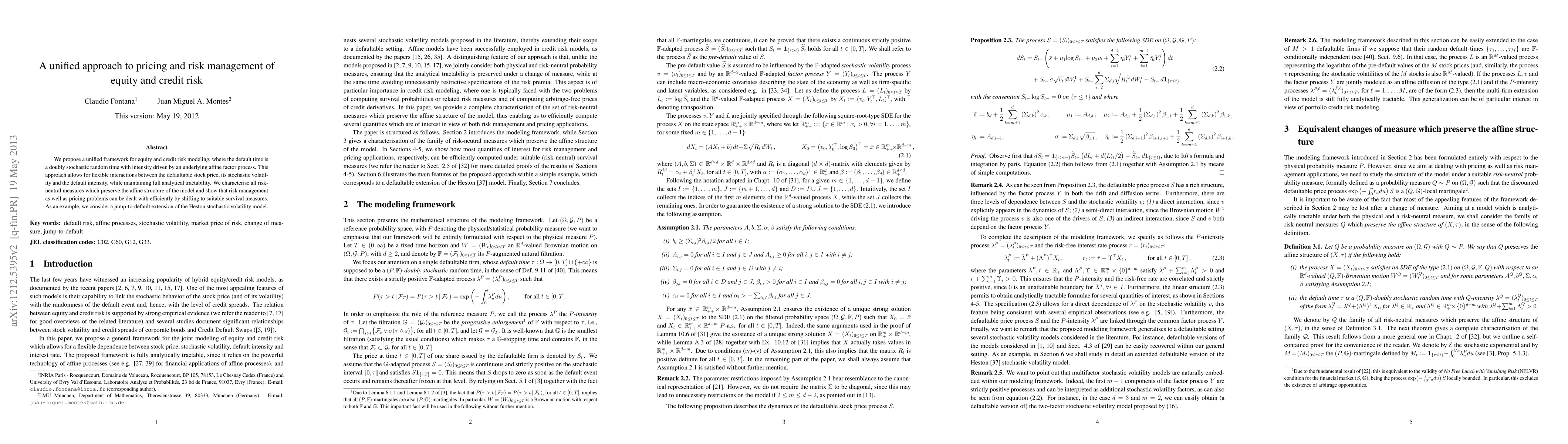 This paper presents a unified framework for equity and credit risk modeling that integrates default time with an affine factor process, enabling flexible interactions between stock price, volatility, and default intensity while maintaining analytical tractability. The approach facilitates efficient pricing and risk management through suitable survival measures.