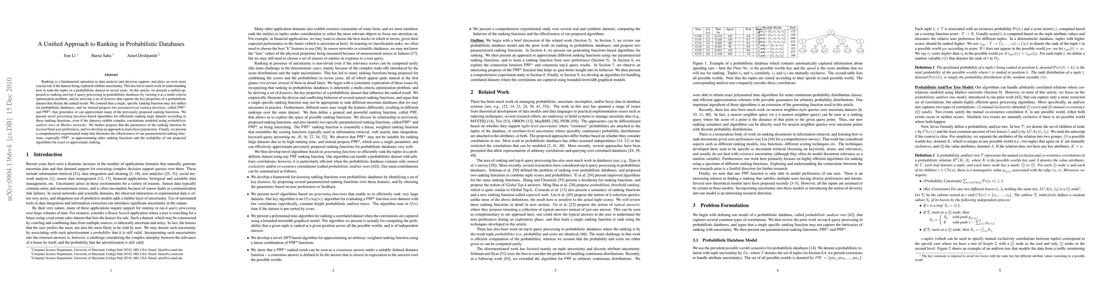 This paper proposes a unified approach to ranking and top-k query processing in probabilistic databases, framing it as a multi-criteria optimization problem. It introduces two parameterized ranking functions, PRF-w and PRF-e, which generalize existing methods and presents efficient algorithms for large datasets, even with complex correlations.