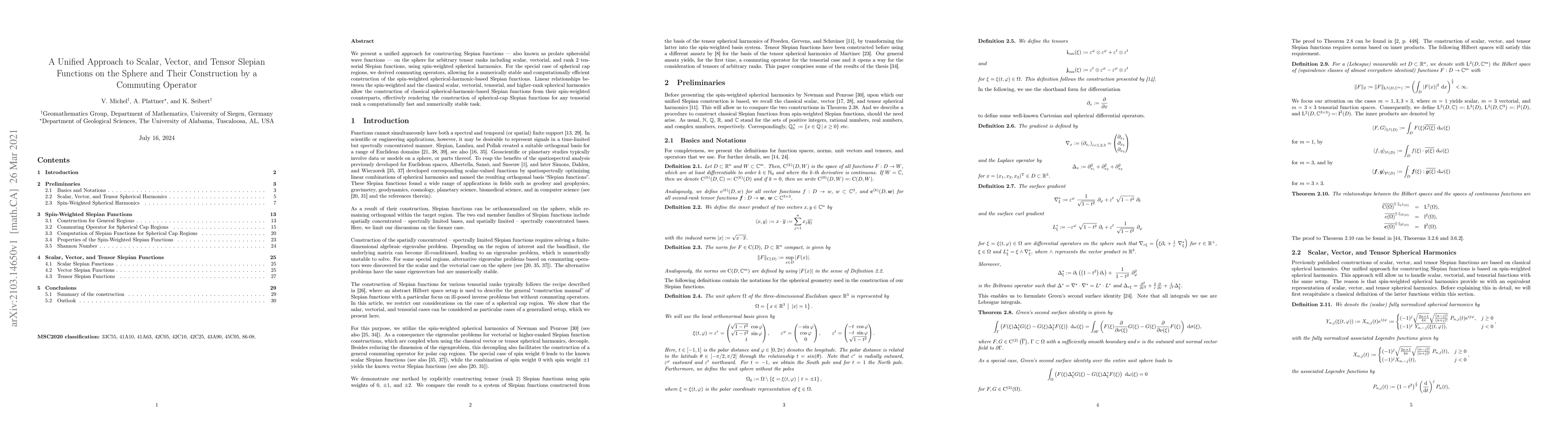 This paper introduces a unified method for constructing Slepian functions on the sphere for scalar, vector, and tensor ranks using spin-weighted spherical harmonics. It provides a numerically stable construction for spherical cap regions via commuting operators, and establishes linear relationships to construct classical spherical harmonics-based Slepian functions efficiently.