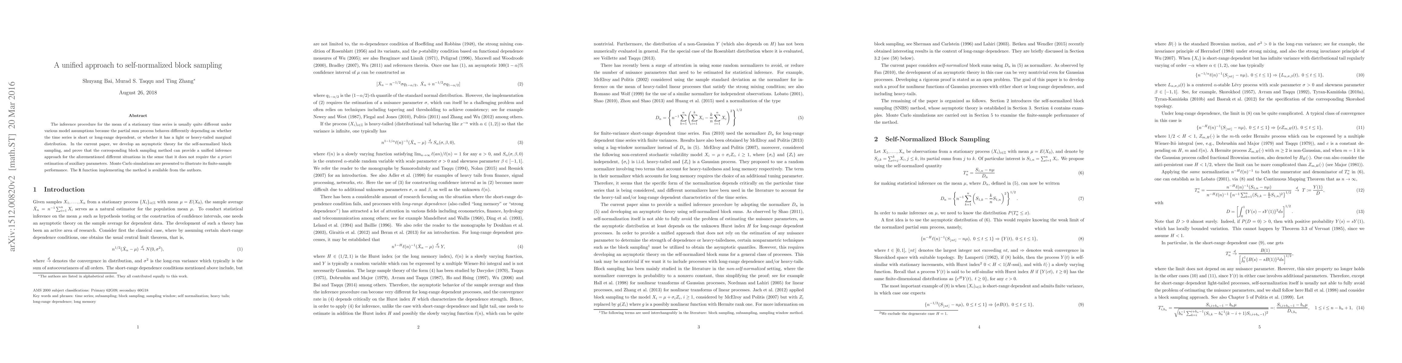 This paper develops an asymptotic theory for self-normalized block sampling to provide a unified inference method for the mean of stationary time series, regardless of short-range or long-range dependence or light or heavy-tailed distributions, without requiring prior estimation of auxiliary parameters. Monte Carlo simulations demonstrate its effectiveness in finite samples.