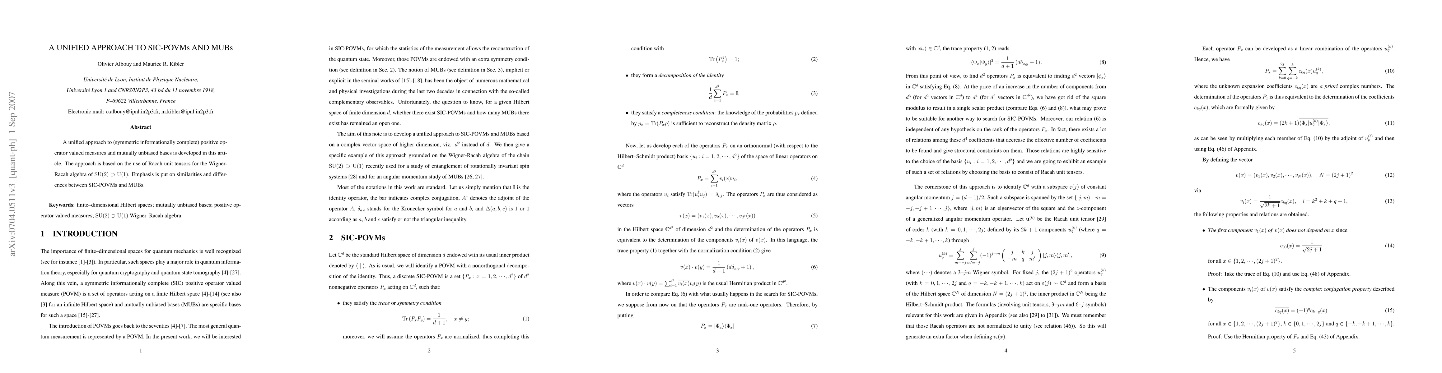This paper develops a unified approach to symmetric informationally complete positive operator valued measures (SIC-POVMs) and mutually unbiased bases (MUBs) using operator equivalents in the enveloping algebra of SU(2), highlighting their similarities and differences.
