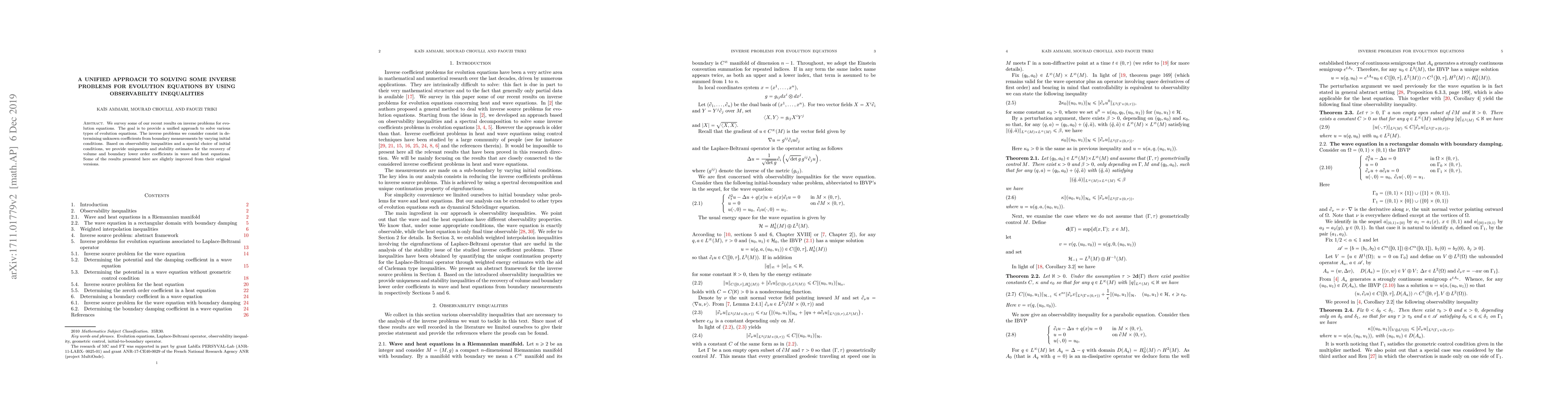 This paper surveys recent results on inverse problems for evolution equations, aiming to unify solutions through observability inequalities. It focuses on determining unknown coefficients from boundary measurements, providing uniqueness and stability estimates for recovering volume and boundary lower-order coefficients in wave and heat equations.