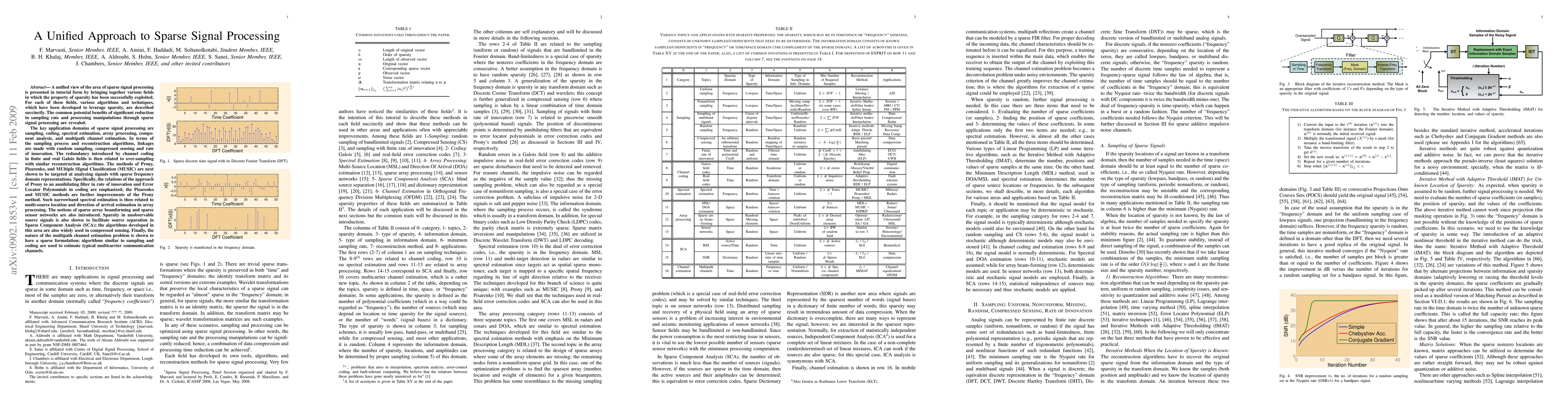 A unified view of sparse signal processing is presented in tutorial form by bringing together various fields. For each of these fields, various algorithms and techniques, which have been developed to leverage sparsity, are described succinctly. The common benefits of significant reduction in sampling rate and processing manipulations are revealed. The key applications of sparse signal processing are sampling, coding, spectral estimation, array processing, component analysis, and multipath channel estimation. In terms of reconstruction algorithms, linkages are made with random sampling, compressed sensing and rate of innovation. The redundancy introduced by channel coding in finite/real Galois fields is then related to sampling with similar reconstruction algorithms. The methods of Prony, Pisarenko, and MUSIC are next discussed for sparse frequency domain representations. Specifically, the relations of the approach of Prony to an annihilating filter and Error Locator Polynomials in coding are emphasized; the Pisarenko and MUSIC methods are further improvements of the Prony method. Such spectral estimation methods is then related to multi-source location and DOA estimation in array processing. The notions of sparse array beamforming and sparse sensor networks are also introduced. Sparsity in unobservable source signals is also shown to facilitate source separation in SCA; the algorithms developed in this area are also widely used in compressed sensing. Finally, the multipath channel estimation problem is shown to have a sparse formulation; algorithms similar to sampling and coding are used to estimate OFDM channels.