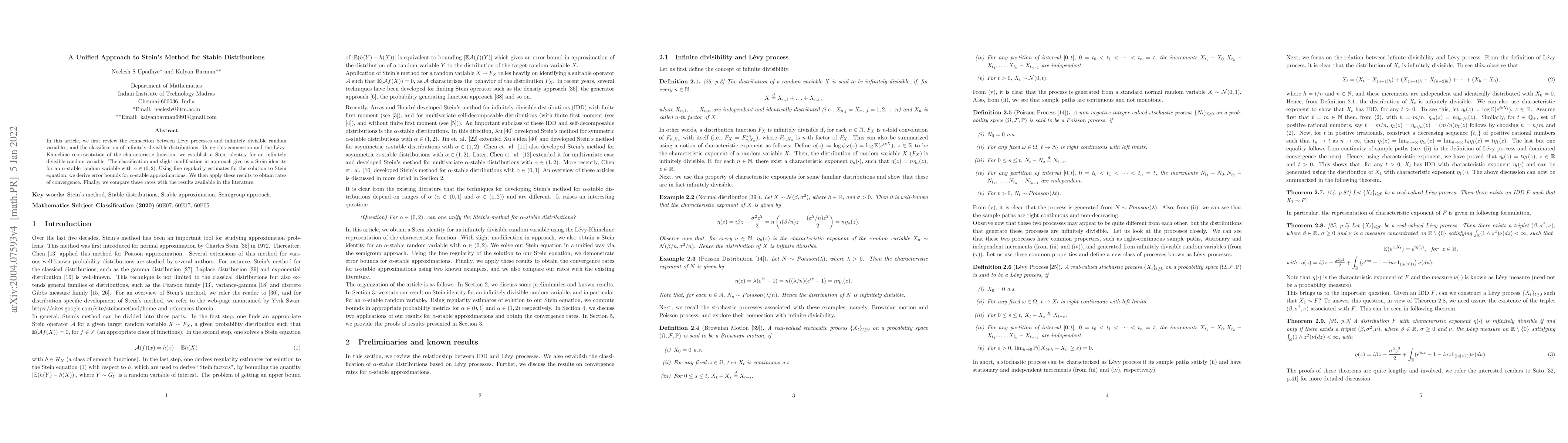 In this article, we first review the connection between L\'evy processes and infinitely divisible random variables, and the classification of infinitely divisible distributions. Using this connection and the L\'evy-Khinchine representation of the characteristic function, we establish a Stein identity for an infinitely divisible random variable. The classification and slight modification in approach give us a Stein identity for an $\alpha$-stable random variable with $\alpha\in (0,2).$ Using fine regularity estimates for the solution to Stein equation, we derive error bounds for $\alpha$-stable approximations. We then apply these results to obtain rates of convergence. Finally, we compare these rates with the results available in the literature.