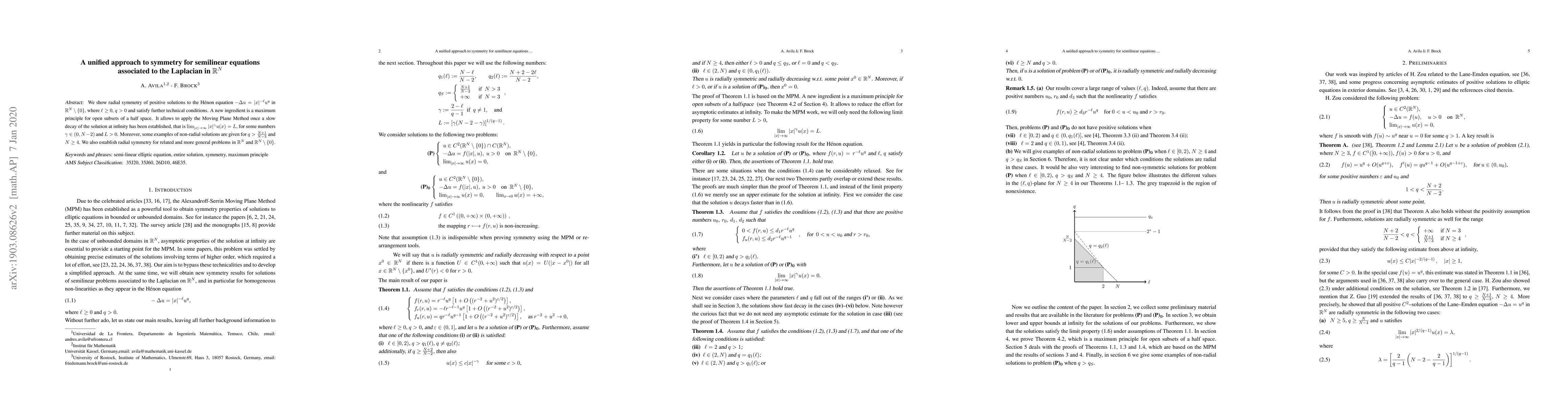 We show radial symmetry of positive solutions to the H\'{e}non equation $-\Delta u = |x|^{-\ell} u^q $ in $\mathbb{R}^N \setminus \{ 0\} $, where $\ell \geq 0$, $q>0$ and satisfy further technical conditions. A new ingredient is a maximum principle for open subsets of a half space. It allows to apply the Moving Plane Method once a slow decay of the solution at infinity has been established, that is $\lim _{|x|\to \infty } |x|^{\gamma } u(x) =L $, for some numbers $\gamma \in (0, N-2)$ and $L >0$. Moreover, some examples of non-radial solutions are given for $q> \frac{N+1}{N-3}$ and $N\geq 4$. We also establish radial symmetry for related and more general problems in $\mathbb{R}^N $ and $\mathbb{R}^N \setminus \{ 0\} $.