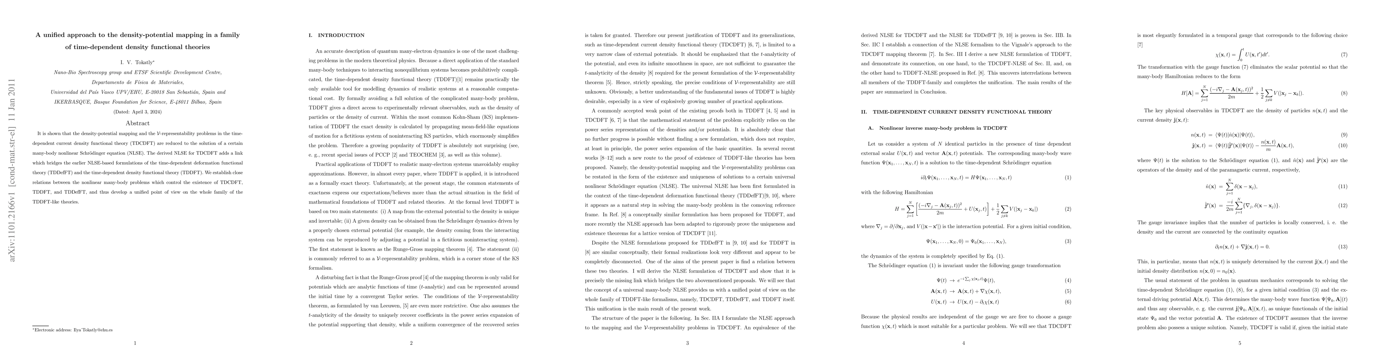 This paper presents a unified approach to solving density-potential mapping and ${\cal V}$-representability in time-dependent density functional theories (TDCDFT), reducing these problems to a many-body nonlinear Schrödinger equation (NLSE). It establishes connections between TDCDFT, TDDFT, and TDDefFT, thereby providing a comprehensive view of the TDDFT-like theories.